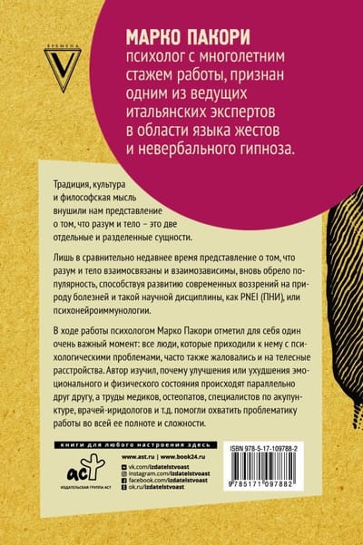 Лишь в сравнительно недавнее время представление о том, что разум и тело взаимосвязаны и взаимозависимы, вновь обрело популярность, способствуя развитию современных воззрений на природу болезней и такой научной дисциплины, как PNEI (ПНИ) или психонейроиммунологии. В ходе работы психологом, Марко Пакори отметил для себя один очень важный момент: все люди, которые приходили к нему с психологическими проблемами, часто также жаловались и на телесные расстройства. Автор изучил, почему улучшения или ухудшения эмоционального и физического состояния происходят параллельно друг с другом, а труды медиков, остеопатов, специалистов по акупунктуре, врачей-иридологов и т.д. помогли охватить проблематику работы во всей ее полноте и сложности.
