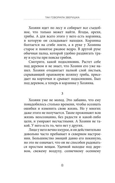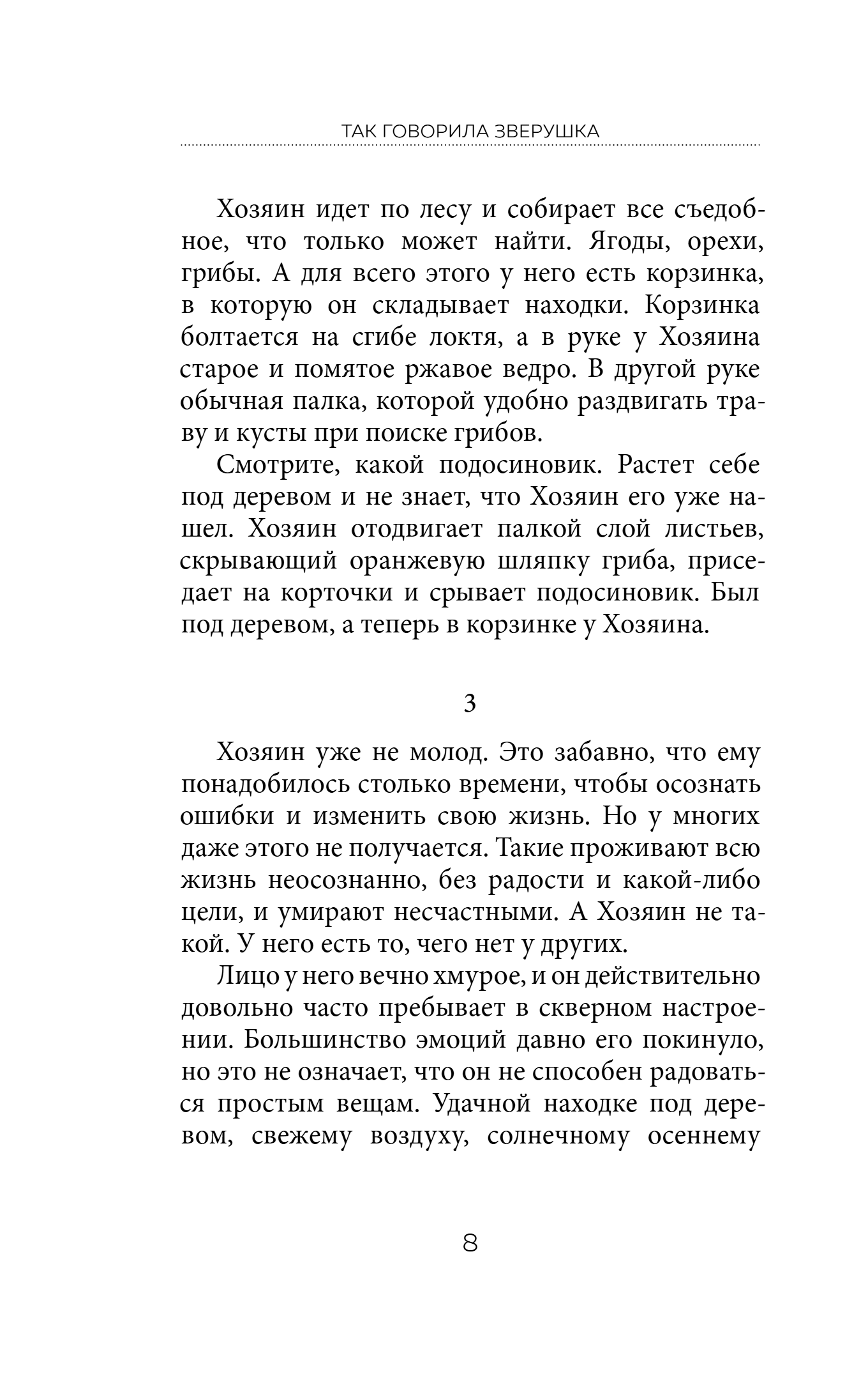 На опушке леса стоит одинокая хижина. Загляните в ее мутное окно – вы увидите Хозяина и Зверушку. Один ищет здесь искупление грехов и утешение от прошлых обид. Что до второй – она живет тут не по своей воле, когда-то ее приручили. Хозяин ловит рыбу, собирает ягоды и грибы. Зверушка ждет дома, не сводя глаз с двери. Их жизнь не похожа на идиллию, но время от времени они чувствуют себя значимыми, потому что есть друг у друга. Однажды Хозяин уходит. Зверушка наконец свободна. Но какой выбор она сделает? Нисколько не сомневаясь, она отправляется на поиски единственного человека, который ей дорог. Упорно продирается сквозь тьму неизвестности навстречу границе между нормальностью и безумием. Впереди – бесконечная ночь и жестокие испытания. В борьбе за свою жалкую жизнь герои обретут что-то важное. Ну а мы будем тихонько наблюдать за ними.
