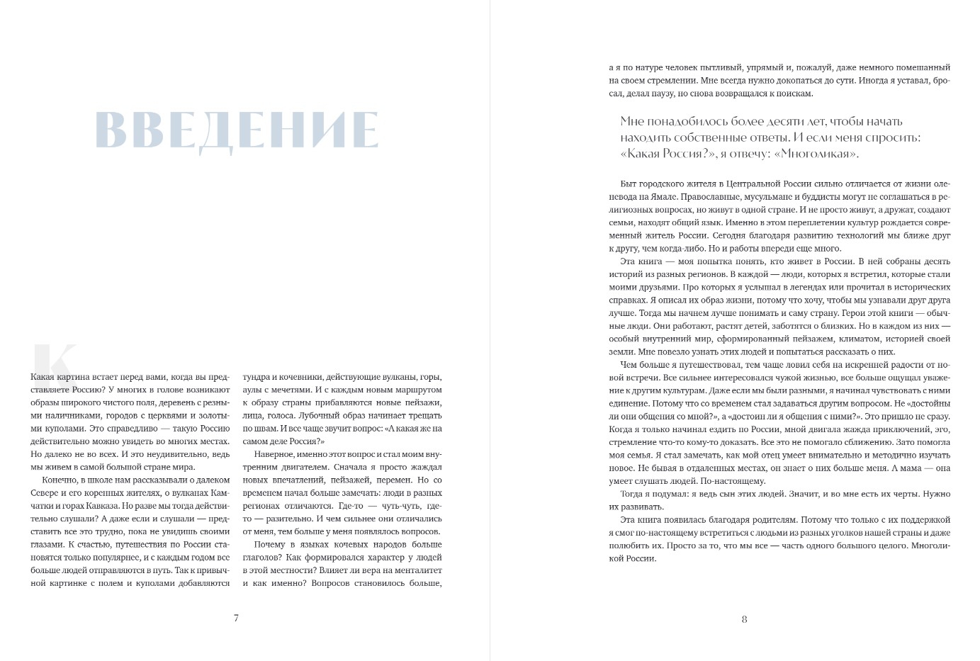 Эта книга — десять путешествий по таким разным краям страны: от побережья Камчатки до гор Дагестана, от далекой Чукотки до таинственных Курильских островов. Это не путеводитель и не исторический труд — это живое, честное путешествие навстречу людям. Автор разговаривает с оленеводами Ямала, смотрит в глаза дагестанским пастухам, узнает основы иконописи в Великом Новгороде и встречает рассветы на Енисее. Здесь собраны не только редкие маршруты, но и голоса. У каждого региона — свое лицо. У каждого героя — своя история.