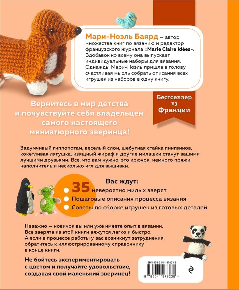 Мари-Ноэль Баярд, автор множества книг по вязанию, предлагает вам создать 35 невероятно милых зверят. Неважно — новичок вы или уже имеете опыт в вязании. Все зверята из этой книги вяжутся легко и быстро. Все, что вам нужно, это крючок, немного пряжи, наполнитель и несколько игл для вышивки.