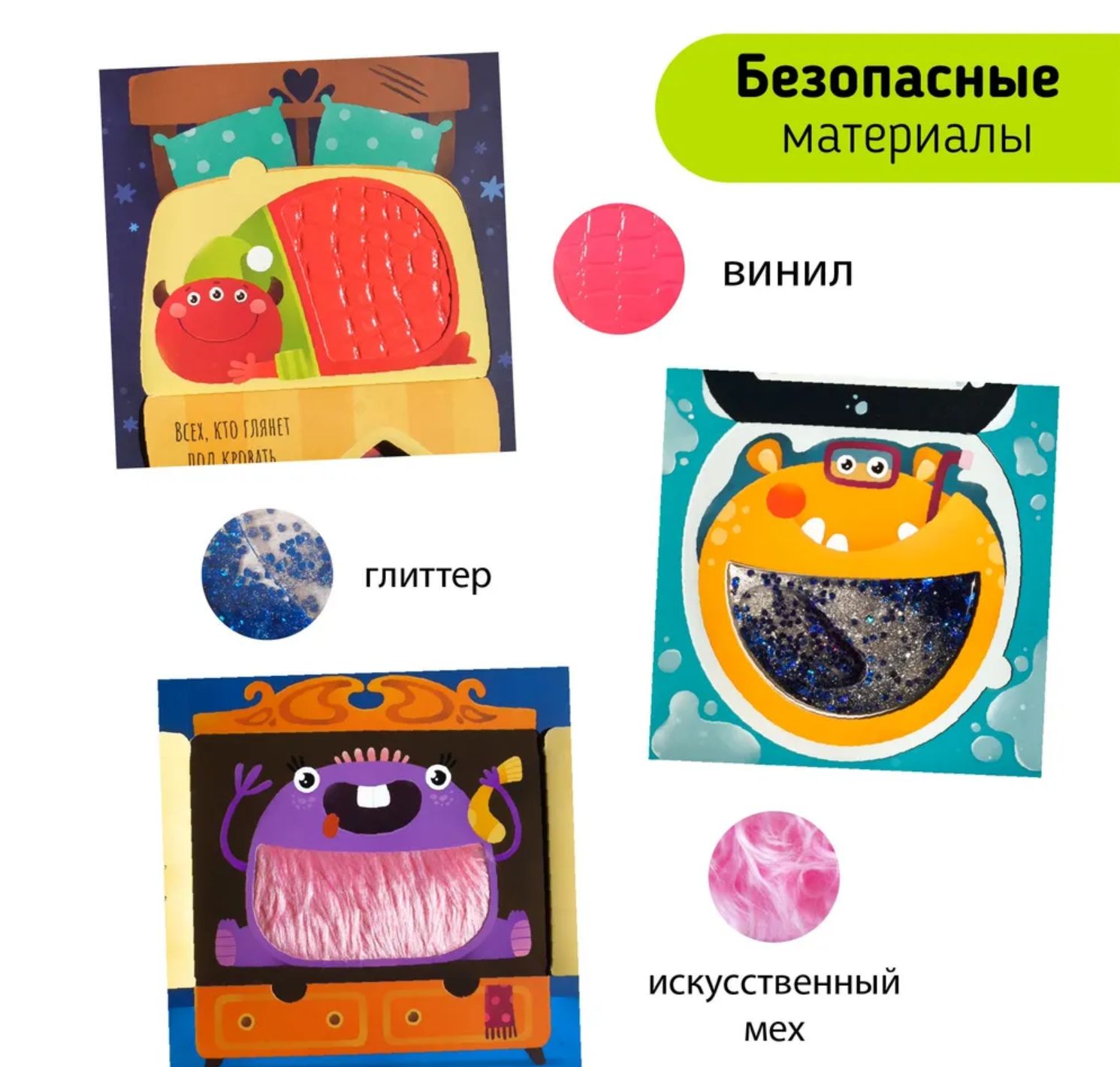 Тактильные вставки «Монстров» особенно ценят наши маленькие читатели. Они выполнены из ткани, меха, фольги, винила, ПВХ и блесток. Последние стали любимыми у детей и родителей.