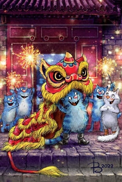 Открытка. Синие коты. Танец льва