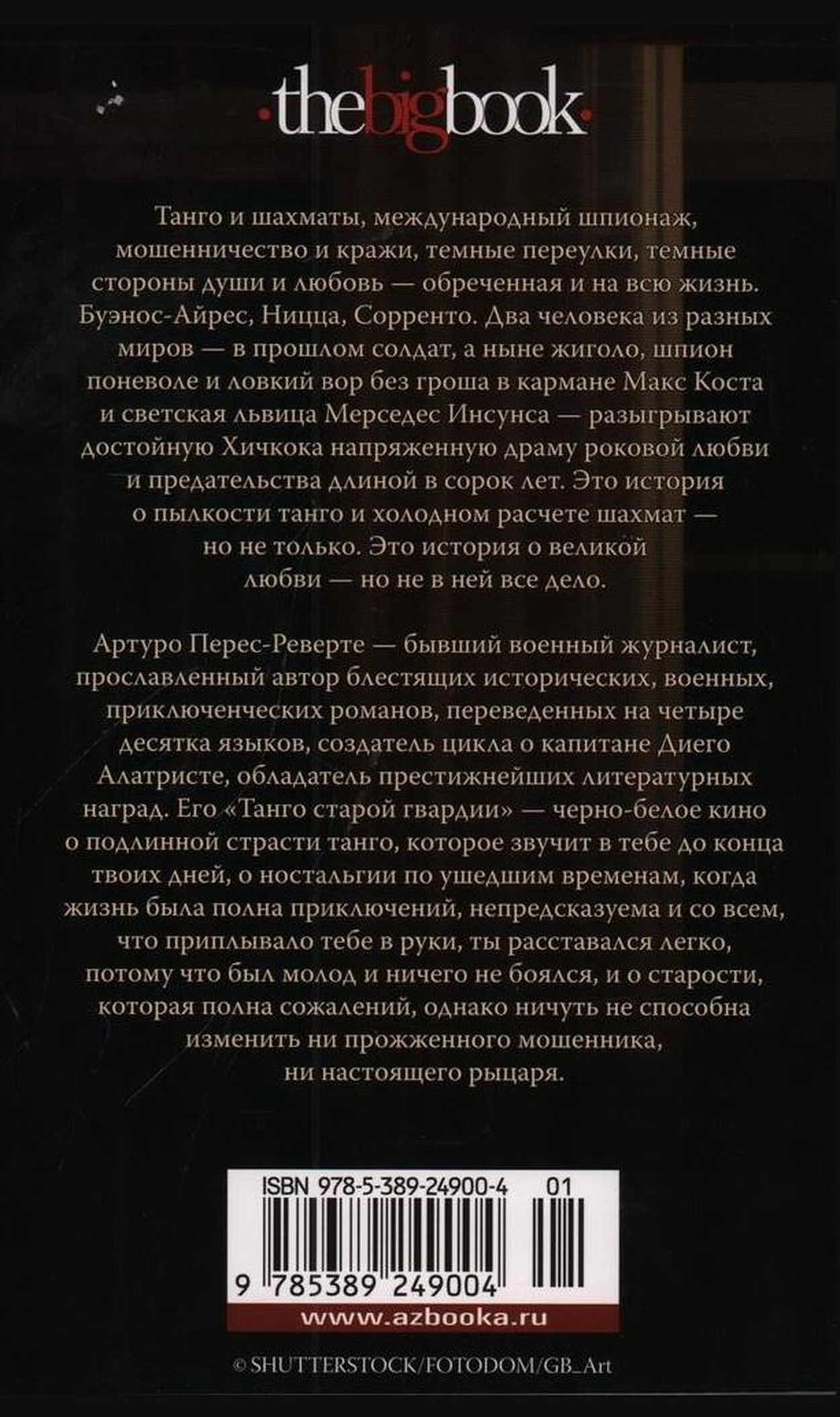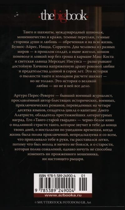 Артуро Перес-Реверте — бывший военный журналист, прославленный автор блестящих исторических, военных, приключенческих романов, переведенных на сорок языков, создатель цикла о капитане Диего Алатристе, обладатель престижнейших литературных наград. Его «Танго старой гвардии» — черно-белое кино о подлинной страсти танго, которое звучит в тебе до конца твоих дней, о ностальгии по ушедшим временам, когда жизнь была полна приключений, непредсказуема и со всем, что приплывало тебе в руки, ты расставался легко, потому что был молод и ничего не боялся, и о старости, которая полна сожалений, однако ничуть не способна изменить ни прожженного мошенника, ни настоящего рыцаря.