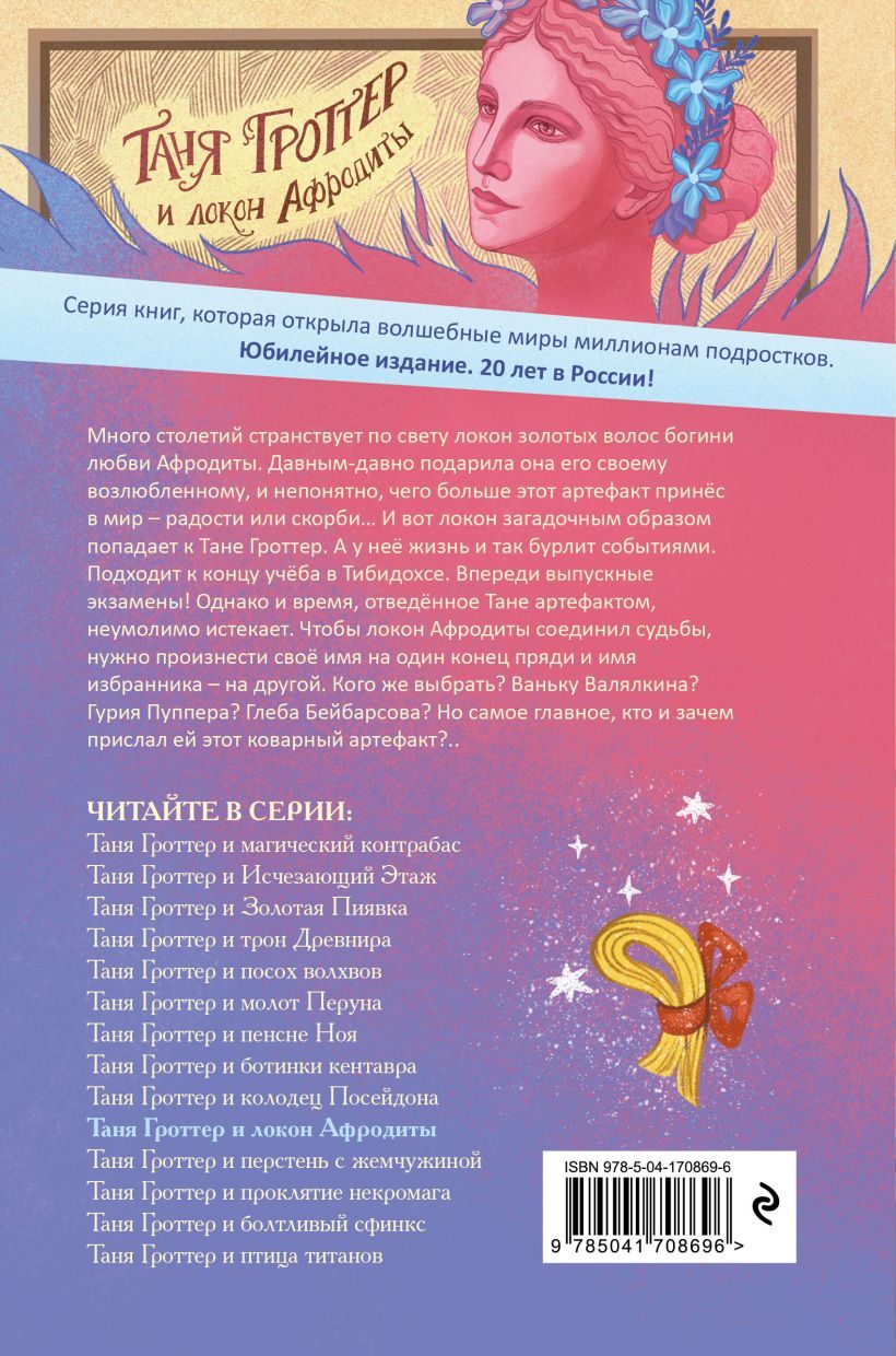 Много столетий странствует по свету локон золотых волос богини любви Афродиты. Давным-давно подарила она его своему возлюбленному, и непонятно, чего больше этот артефакт принес в мир — радости или скорби… И вот локон загадочным образом попадает к Тане Гроттер. А у нее жизнь и так бурлит событиями. Подходит к концу учеба в Тибидохсе. Впереди выпускные экзамены! Однако и время, отведенное Тане артефактом, неумолимо истекает. Чтобы локон Афродиты соединил судьбы, нужно произнести свое имя на один конец пряди и имя избранника — на другой. Кого же выбрать? Ваньку Валялкина? Гурия Пуппера? Глеба Бейбарсова? Но самое главное, кто и зачем прислал ей этот коварный артефакт?..