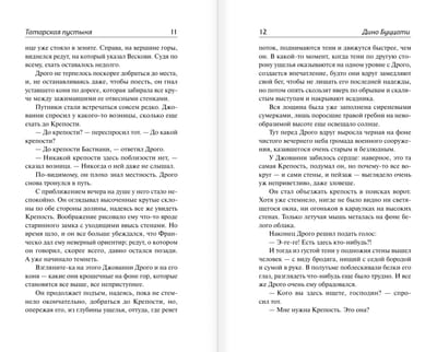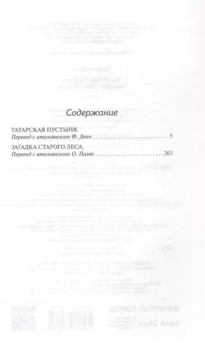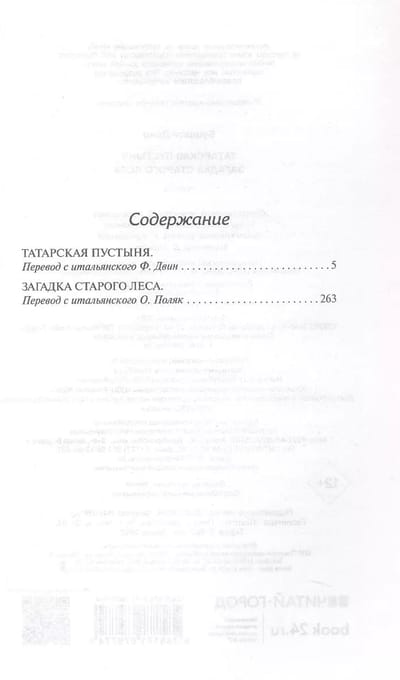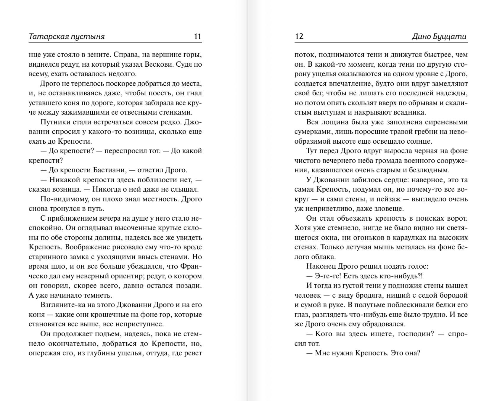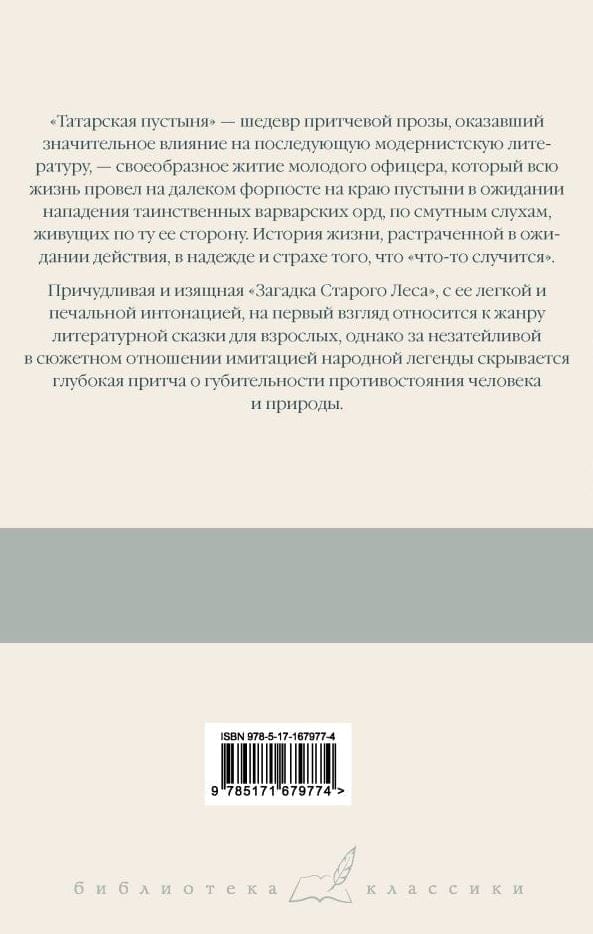 «Татарская пустыня» — шедевр притчевой прозы, оказавший значительное влияние на последующую модернистскую литературу, — своеобразное житие молодого офицера, который всю жизнь провел на далеком форпосте на краю пустыни в ожидании нападения таинственных варварских орд, по смутным слухам, живущих по ту ее сторону. История жизни, растраченной в ожидании действия, в надежде и страхе того, что «что-то случится».