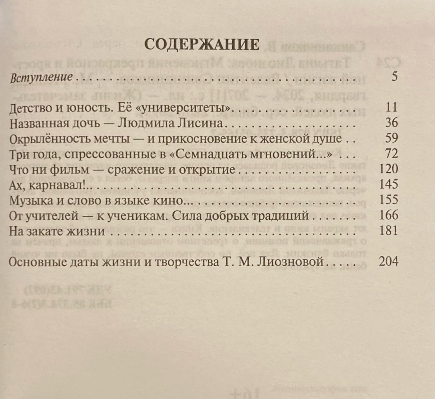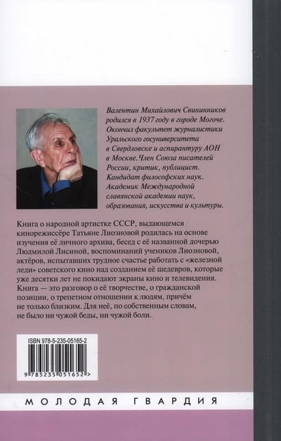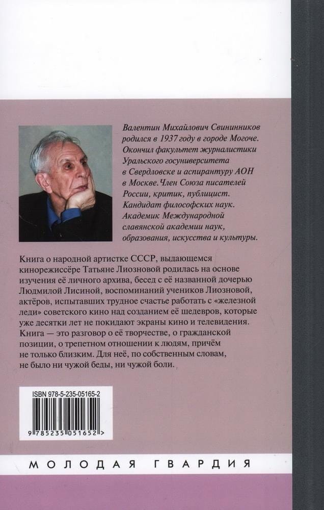 Книга о народной артистке СССР, выдающемся кинорежиссёре Татьяне Лиозновой родилась на основе тщательного изучения её личного архива, проведённого автором книги впервые, бесед с её названной дочерью Людмилой Лисиной, воспоминаний учеников Лиозновой, актёров, испытавших трудное счастье работать с «железной леди» советского кино над созданием её шедевров, которые уже десятки лет не покидают экраны кино и телевидения. Книга — это разговор о её творчестве, о гражданской позиции, о трепетном отношении к людям, причём не только близким. Для неё, по собственным словам, не было ни чужой беды, ни чужой боли.