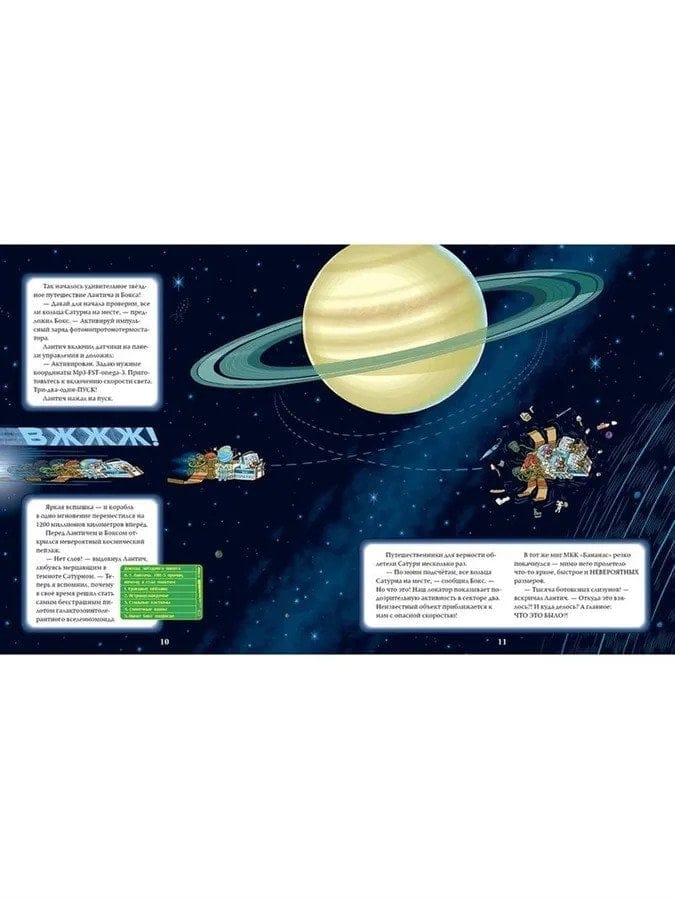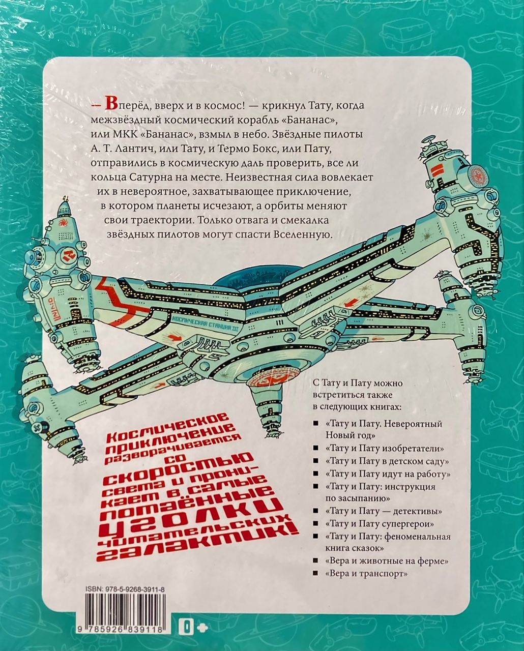 Вперед, вверх и в космос! - крикнул Тату, когда межзвездный космический корабль "Бананас", или МКК "Бананас", взмыл в небо. Звездные пилоты А. Т. Лантич, или Тату, и Термо Бокс, или Пату, отправились в космическую даль проверить, все ли кольца Сатурна на месте. Неизвестная сила вовлекает их в невероятное, захватывающее приключение, в котором планеты исчезают, а орбиты меняют свои траектории. Только отвага и смекалка звездных пилотов могут спасти Вселенную. Космическое приключение разворачивается со скоростью света и проникает в самые потаенные уголки читательских галактик.