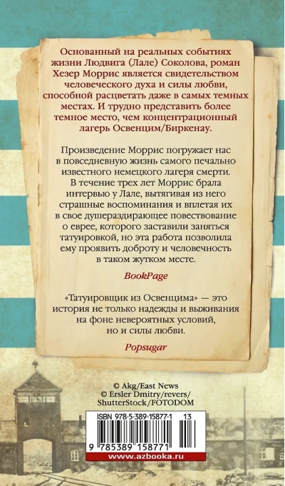 Основанный на реальных событиях жизни Людвига (Лале) Соколова, роман Хезер Моррис является свидетельством человеческого духа и силы любви, способной расцветать даже в самых темных местах. И трудно представить более темное место, чем концентрационный лагерь Освенцим/Биркенау. В 1942 году Лале, как и других словацких евреев, отправляют в Освенцим. Оказавшись там, он, благодаря тому, что говорит на нескольких языках, получает работу татуировщика и с ужасающей скоростью набивает номера новым заключенным, а за это получает некоторые привилегии: отдельную каморку, чуть получше питание и относительную свободу перемещения по лагерю. Однажды в июле 1942 года Лале, заключенный 32407, наносит на руку дрожащей молодой женщине номер 34902. Ее зовут Гита. Несмотря на их тяжелое положение, несмотря на то, что каждый день может стать последним, они влюбляются и вопреки всему верят, что сумеют выжить в этих нечеловеческих условиях. И хотя положение Лале как татуировщика относительно лучше, чем остальных заключенных, но не защищает от жестокости эсэсовцев. Снова и снова рискует он жизнью, чтобы помочь своим товарищам по несчастью и в особенности Гите и ее подругам. Несмотря постоянную угрозу смерти, Лале и Гита никогда не перестают верить в будущее. И в этом будущем они обязательно будут жить вместе долго и счастливо…