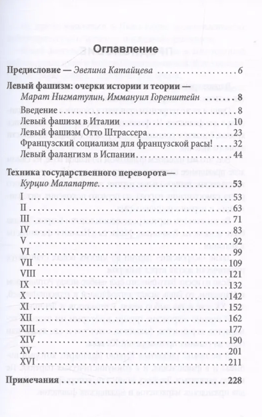 Книга состоит из размышлений Курцио Малапарте о современных переворотах. Большевистская революция в России (1917), Капповский путч в Германии (1920), Марш на Рим Бенито Муссолини (1922), приход к власти Мигеля Примо де Риверы в Испании (1923), Наполеон Бонапарт как изобретатель современного государственного переворота, а также возможность прихода к власти в Германии Адольфа Гитлера.