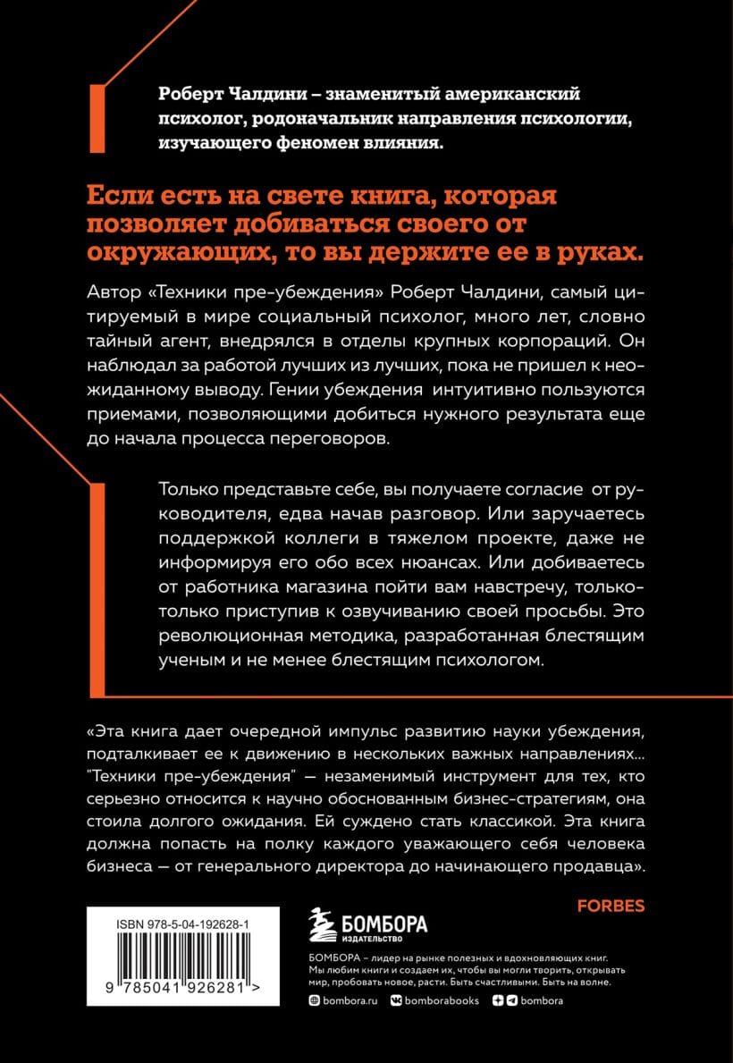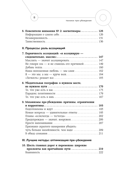 Автор «Техники пре-убеждения» Роберт Чалдини, самый цитируемый в мире социальный психолог, много лет, словно тайный агент, внедрялся в отделы крупных корпораций. Он наблюдал за работой лучших из лучших, пока не пришел к неожиданному выводу. Гении убеждения интуитивно пользуются приемами, позволяющими добиться нужного результата еще до начала процесса переговоров.