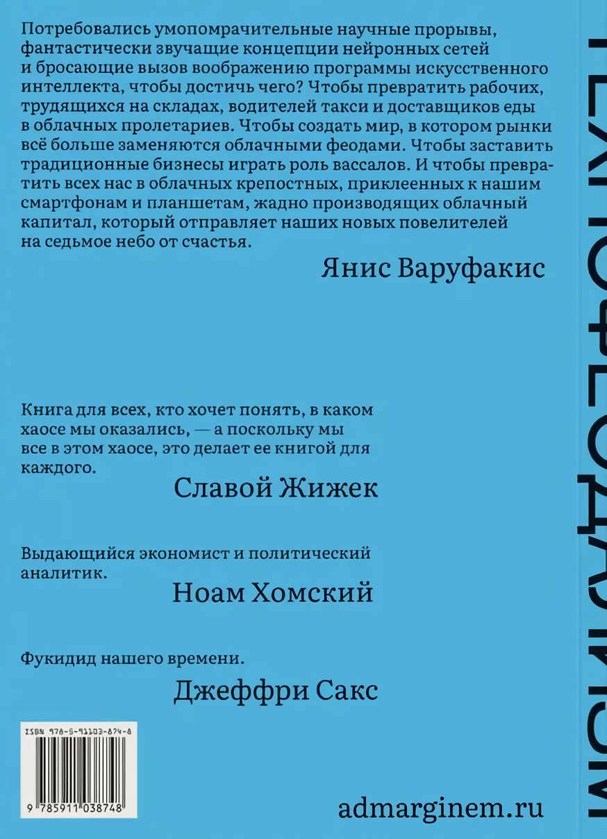 В своей новой книге, уже разошедшейся на цитаты, бывший министр экономики Греции, консультант по виртуальным товарам в играх компании Valve, публицист и теоретик Янис Варуфакис выносит приговор сложившимся мировым хозяйственным отношениям. Анализируя историю развития капитализма, экономические кризисы XX–XXI веков, а также главные политические и социальные потрясения последних десятилетий, Варуфакис показывает, как изобретение интернета и цифровых технологий привело к формированию нового строя — технофеодализма. Теперь миром правят не банкиры и капиталисты, а цифровые феодалы, такие как Google, Apple, Amazon, взимающие облачную ренту со своих вассалов и пользующиеся неоплачиваемым трудом «крепостных» интернет-пользователей. Визионер и бунтарь от экономики Варуфакис рисует карту новой геополитической напряженности между двумя главными технофеодальными странами США и Китаем и намечает пути освобождения «облачных пролетариев» от цифровых оков.