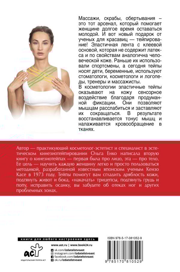 Уколы красоты, массажи, скрабы, обертывания — это тот арсенал, который помогает женщине долгое время оставаться молодой. И вот новый подарок от ученых для красавиц — тейпирование! Эластичная лента с клеевой основой, которая не содержит латекса и по свойствам аналогична человеческой коже. Раньше его использовали спортсмены, а сегодня тейпы носят дети, беременные, используют стоматологи, косметологи и логопеды, тренеры и массажисты. В косметологии эластичные тейпы на кожу оказывают сенсорное воздействие благодаря продуманной фиксации. Они позволяют мышцам расслабиться и заставляют их сокращаться. В результате у них восстанавливается тонус и налаживается кровообращение в тканях. Техника кинезиотепирования в домашних условиях, понятные схемы и иллюстрации для каждой зоны тела.