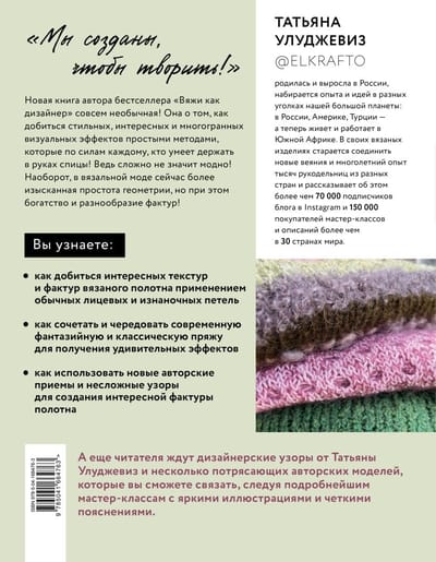 «Вязание — это прежде всего творчество. Разбудите в себе исследователя и не бойтесь экспериментировать! Смешивайте, соединяйте, переплетайте и чередуйте разную по цвету и текстуре пряжу. Ломайте стереотипы!» — так формулирует замечательный мастер Татьяна Улуджевиз идею своей новой необычной книги! Необычна она тем, что предлагает простые и порой неожиданные методы вязания вещей, от которых невозможно отвести глаз, полных дизайнерских находок и уникальных по стилю. И все это не благодаря витиеватым узорам или сложным конструкциям, а благодаря необычной текстуре и фактуре полотна, создать которую невероятно легко, стоит лишь дать волю собственной фантазии. Уроки мастера сделают алгоритм работы с текстурами логичным и понятным.