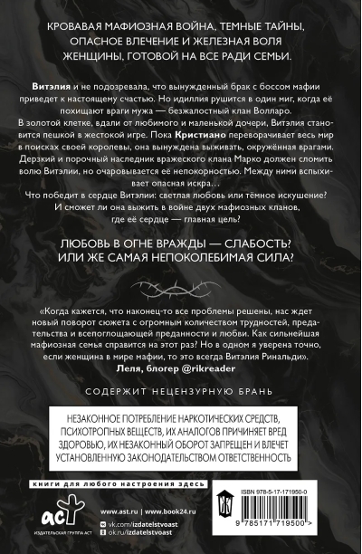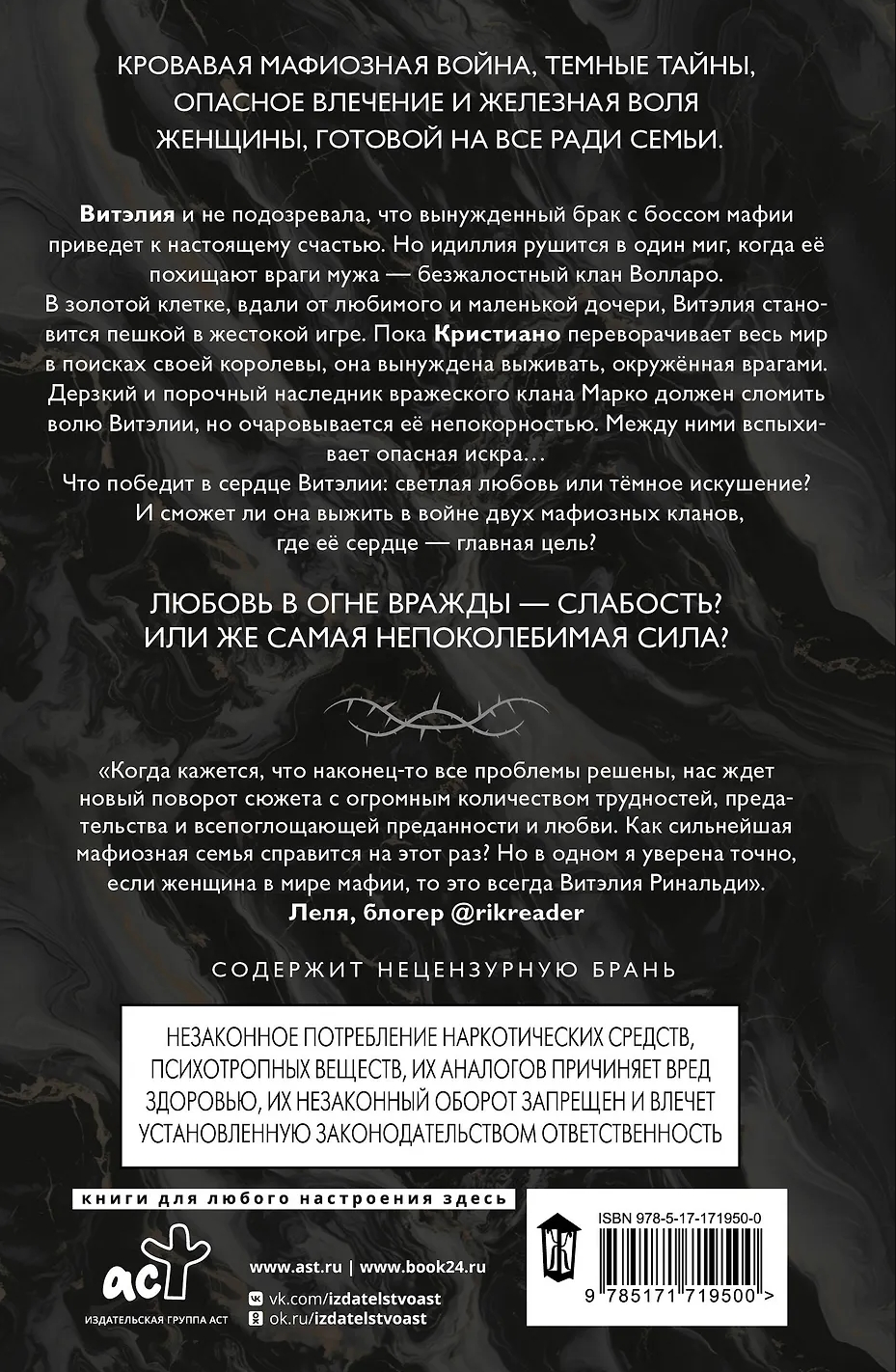 Витэлия и не подозревала, что вынужденный брак с боссом мафии приведет к настоящему счастью. Но идиллия рушится в один миг, когда её похищают враги мужа — безжалостный клан Волларо. В золотой клетке, вдали от любимого и маленькой дочери, Витэлия становится пешкой в жестокой игре. Пока Кристиано переворачивает весь мир в поисках своей королевы, она вынуждена выживать, окружённая врагами. Дерзкий и порочный наследник вражеского клана Марко должен сломить волю Витэлии, но очаровывается её непокорностью. Между ними вспыхивает опасная искра…