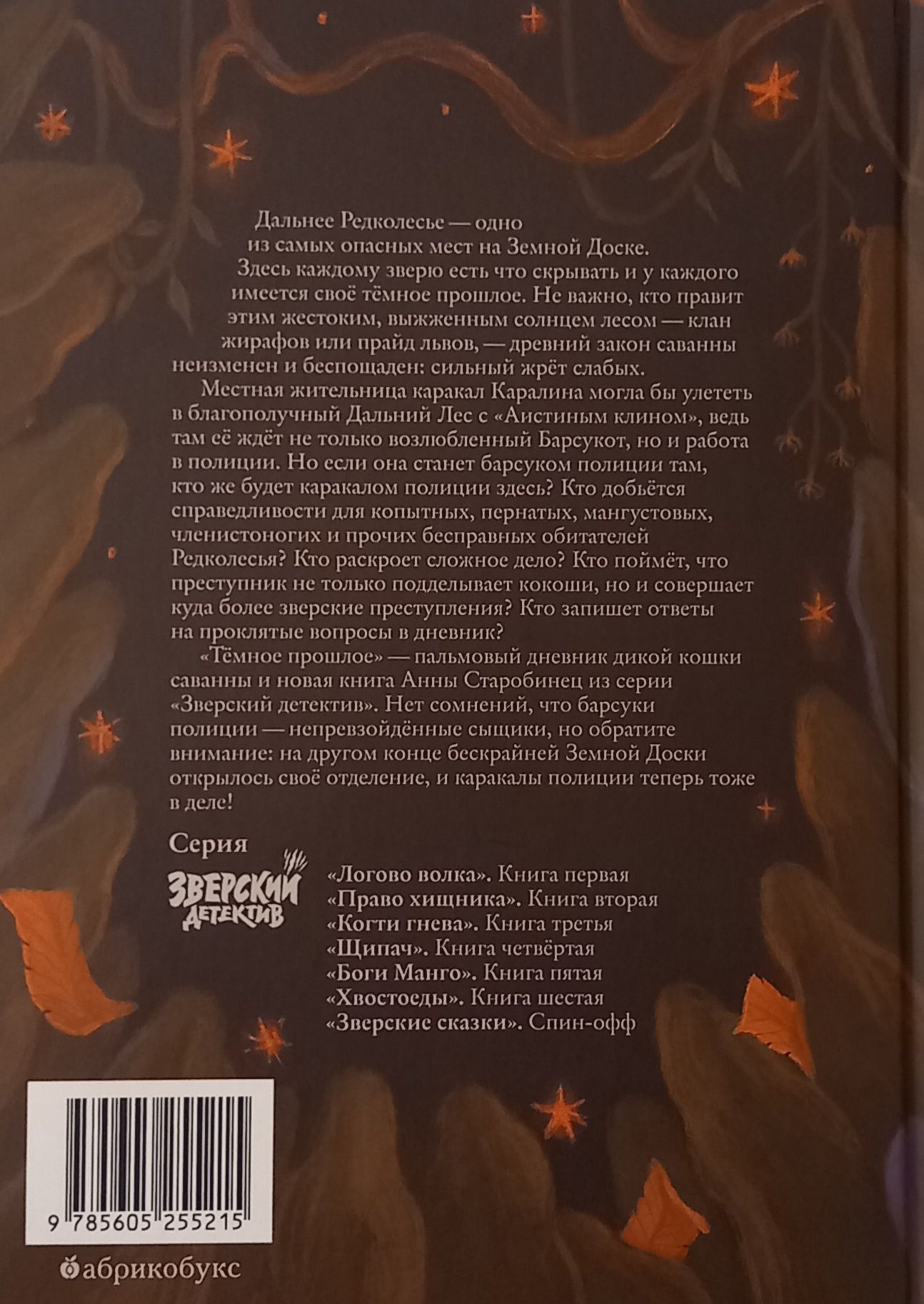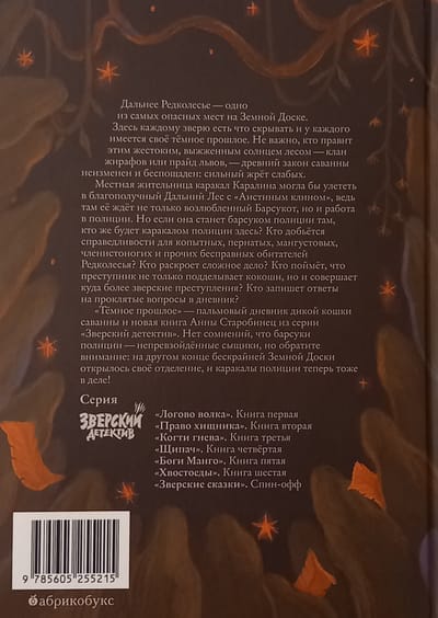 «Тёмное прошлое» — пальмовый дневник дикой кошки саванны и новая книга Анны Старобинец из серии «Зверский детектив». Нет сомнений, что барсуки полиции — непревзойдённые сыщики, но обратите внимание: на другом конце бескрайней Земной Доски открылось своё отделение, и каракалы полиции теперь тоже в деле!
