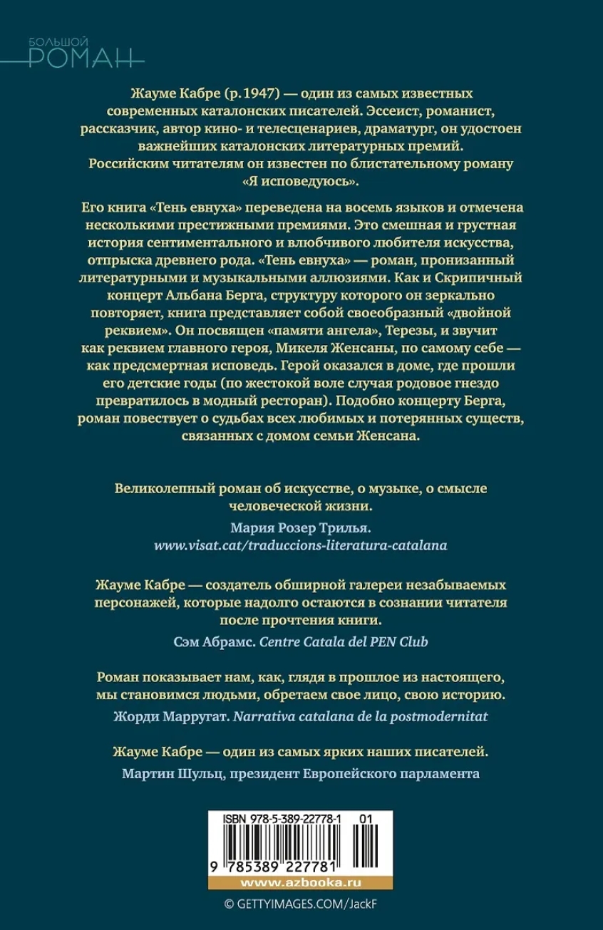 Роман выдающегося каталонского писателя Жауме Кабре «Тень евнуха» - смешная и грустная история сентиментального и влюбчивого любителя искусства, отпрыска древнего рода Женсана, который в поисках Пути, Истины и Жизни посвятил свои студенческие годы вооруженной борьбе за справедливость. «Тень евнуха» - роман, пронизанный литературными и музыкальными аллюзиями. Как и Скрипичный концерт Альбана Берга, структуру которого он зеркально повторяет, книга представляет собой своеобразный «двойной реквием». Он посвящен «памяти ангела», Терезы, и звучит как реквием главного героя, Микеля Женсаны, по самому себе. Рассказ звучит как предсмертная исповедь. Герой оказался в доме, где прошли его детские годы (по жестокой воле случая родовое гнездо превратилось в модный ресторан). Подобно концерту Берга, роман повествует о судьбах всех любимых и потерянных существ, связанных с домом Женсана.