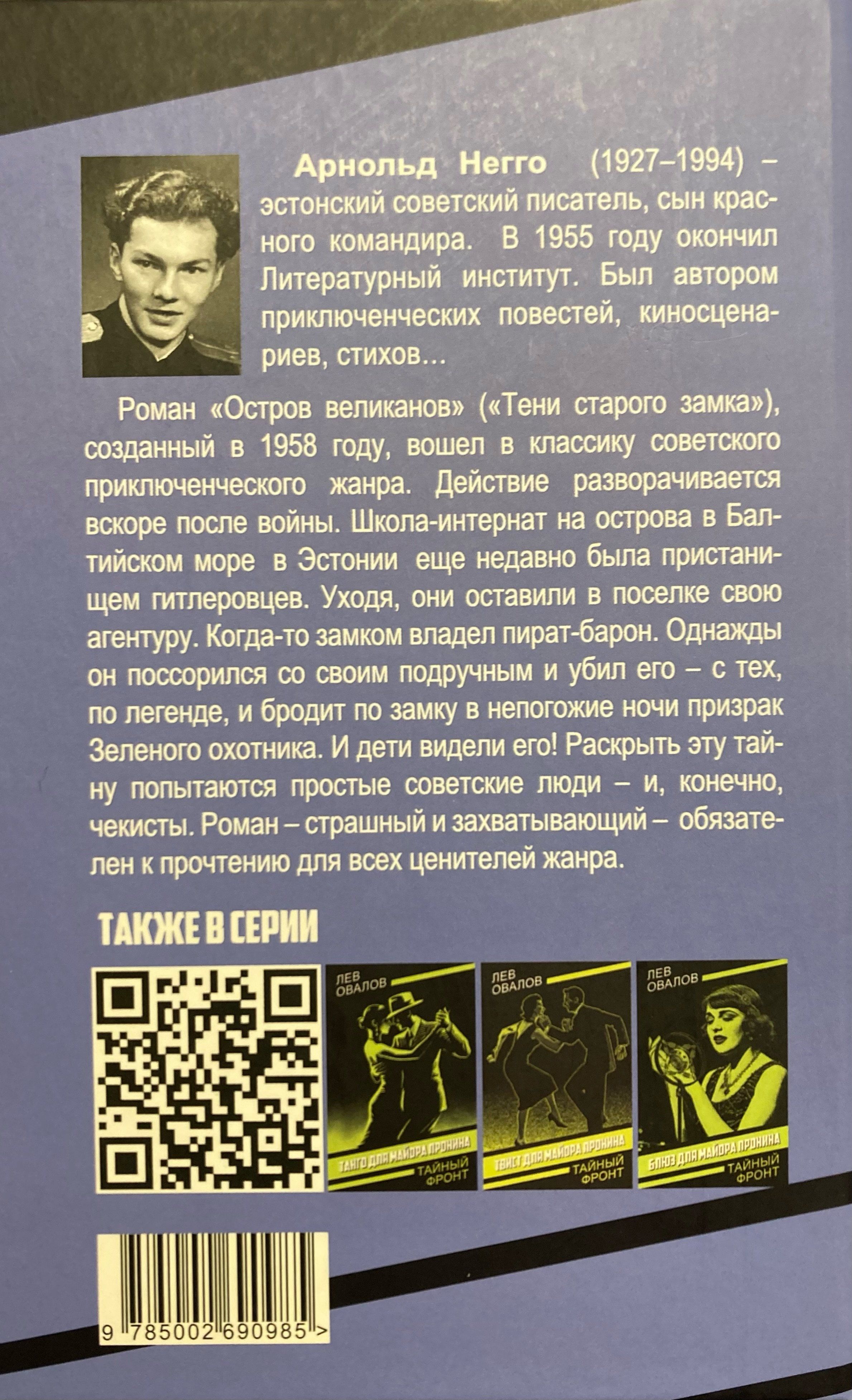 Арнольд Негго (1927 – 1994) – эстонский советский писатель, сын красного командира. В 1955 году окончил Литературный институт. Был автором приключенческих повестей, киносценариев, стихов… Роман «Остров великанов»(«Тени старого замка»), созданный в 1958 году, вошел в классику советского приключенческого жанра. Действие разворачивается вскоре после войны. Школа-интернат на острове в Балтийском море в Эстонии еще недавно была пристанищем гитлеровцев. Уходя, они оставили в поселке свою агентуру. Когда-то замком владел пират-барон. Однажды он поссорился со своим подручным и убил его –с тех пор, по легенде, и бродит по замку в непогожие ночи призрак Зеленого охотника. И дети видели его! Раскрыть эту тайну попытаются простые советские люди – и, конечно, чекисты. Роман – страшный и захватывающий – обязателен к прочтению для всех ценителей жанра.