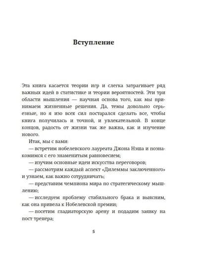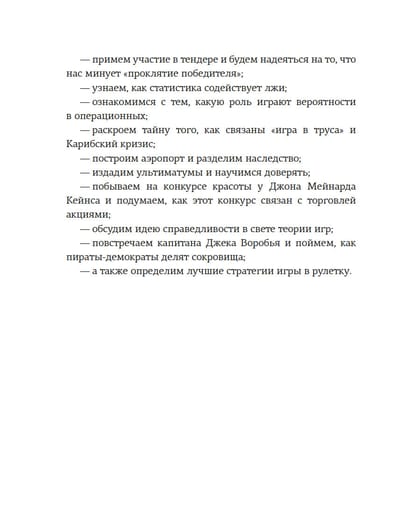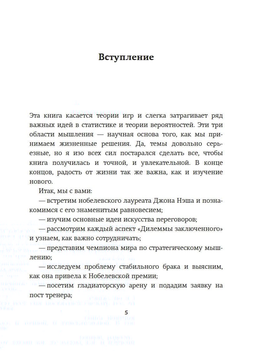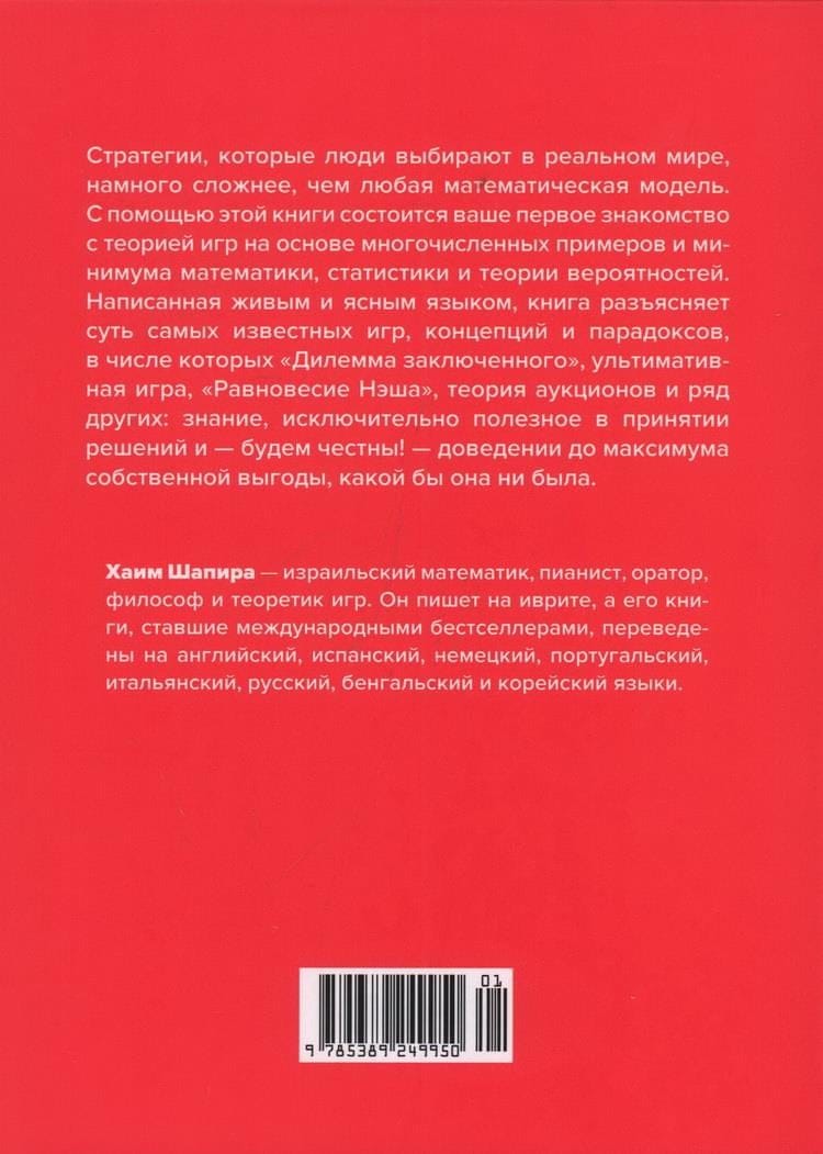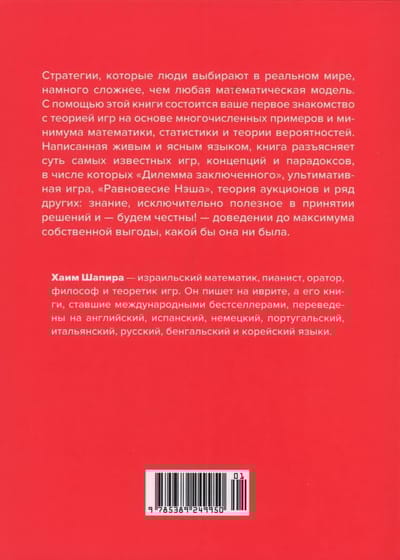На многих примерах Хаим Шапира показывает, что такое теория игр и чем могут закончиться различные взаимодействия между теми, кто принимает решения. «Может ли теория игр улучшить нашу способность принимать повседневные решения? Здесь мнения расходятся. Одни эксперты уверены в том, что теоретики игр оказывают решающее влияние чуть ли не на все события в мире. Но есть и другие эксперты, которые считают, что теория игр — это не более чем занимательная математика, и они не хотят уступать. Истина скрыта где-то между этих полюсов, хотя и не точно посередине. В любом случае теория игр — это захватывающая область мышления и она дает нам понять очень многое в решении самых разных жизненных проблем». (Хаим Шапира)