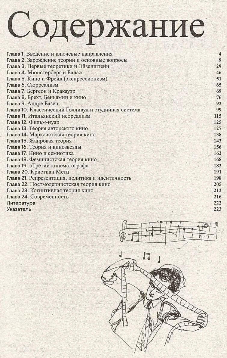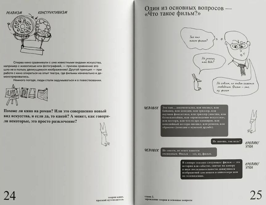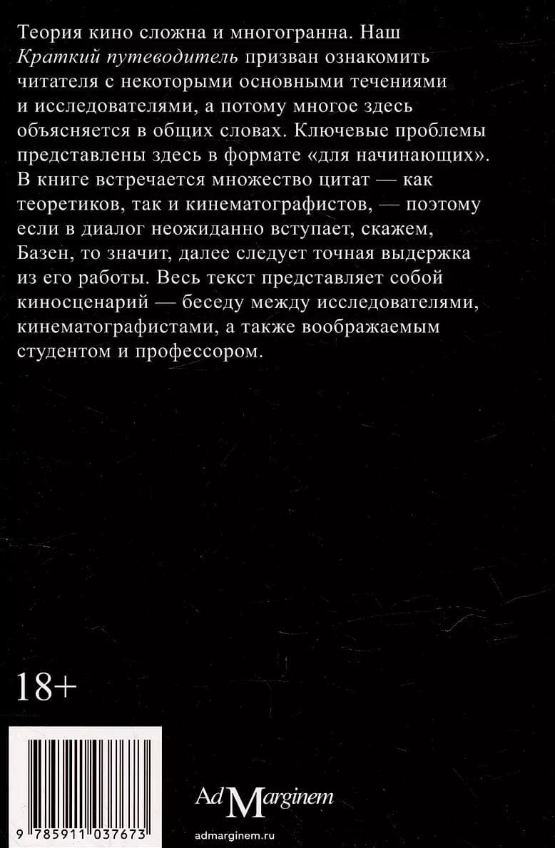 Эта небольшая книга знакомит читателя с основными течениями и исследованиями теории кинематографа, а также этапами эволюции кино: изобретением первой камеры и работами братьев Люмьер, влиянием психоанализа и феминизма на кинокритику, Голливудом и жанровым кино, «третьим кинематографом» и постмодернистской теорией. «Путеводитель» построен в формате сценария к воображаемому фильму и состоит из диалогов студента, его преподавателя, режиссеров, критиков и философов, а текст автора Ричарда Осборна, профессора теории и философии искусства Лондонского университета, сопровождают забавные зарисовки художницы Энджи Брю.