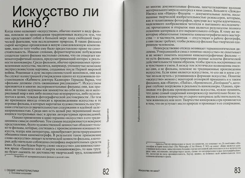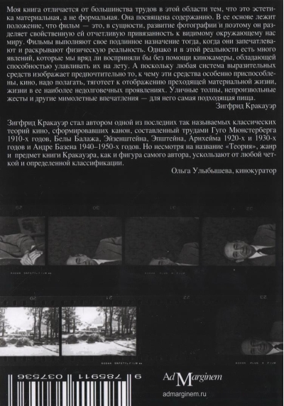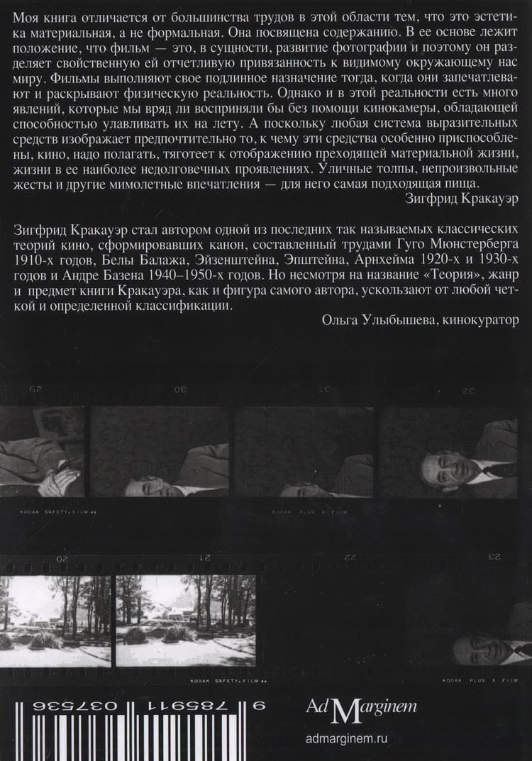 Эта книга — первая полная публикация классической монографии Зигфрида Кракауэра (1889–1966) на русском языке. В своем масштабном труде немецкий социолог массовой культуры проводит всестороннее исследование черно-белого кино через призму философии и медиаэстетики. Сразу после выхода в 1960 году издание подверглось критике за «старомодность». Кракауэр не уделяет внимание современным ему тенденциям — рисованным фильмам и цвету, — анализируя лишь «черно-белое кино, берущее свое начало от фотографии», с целью детально изучить наиболее важные аспекты сущности кинематографа. Для автора камера — это инструмент, способный запечатлеть физическую реальность, и он рассматривает кино как средство отображения переходящей материальной жизни, акцентируя внимание на том, что оно может предложить нашему восприятию мира. Такой подход делает работу Кракауэра книгой вне времени и позволяет автору на каждом этапе развития искусства обращаться с ее страниц к настоящему моменту.
