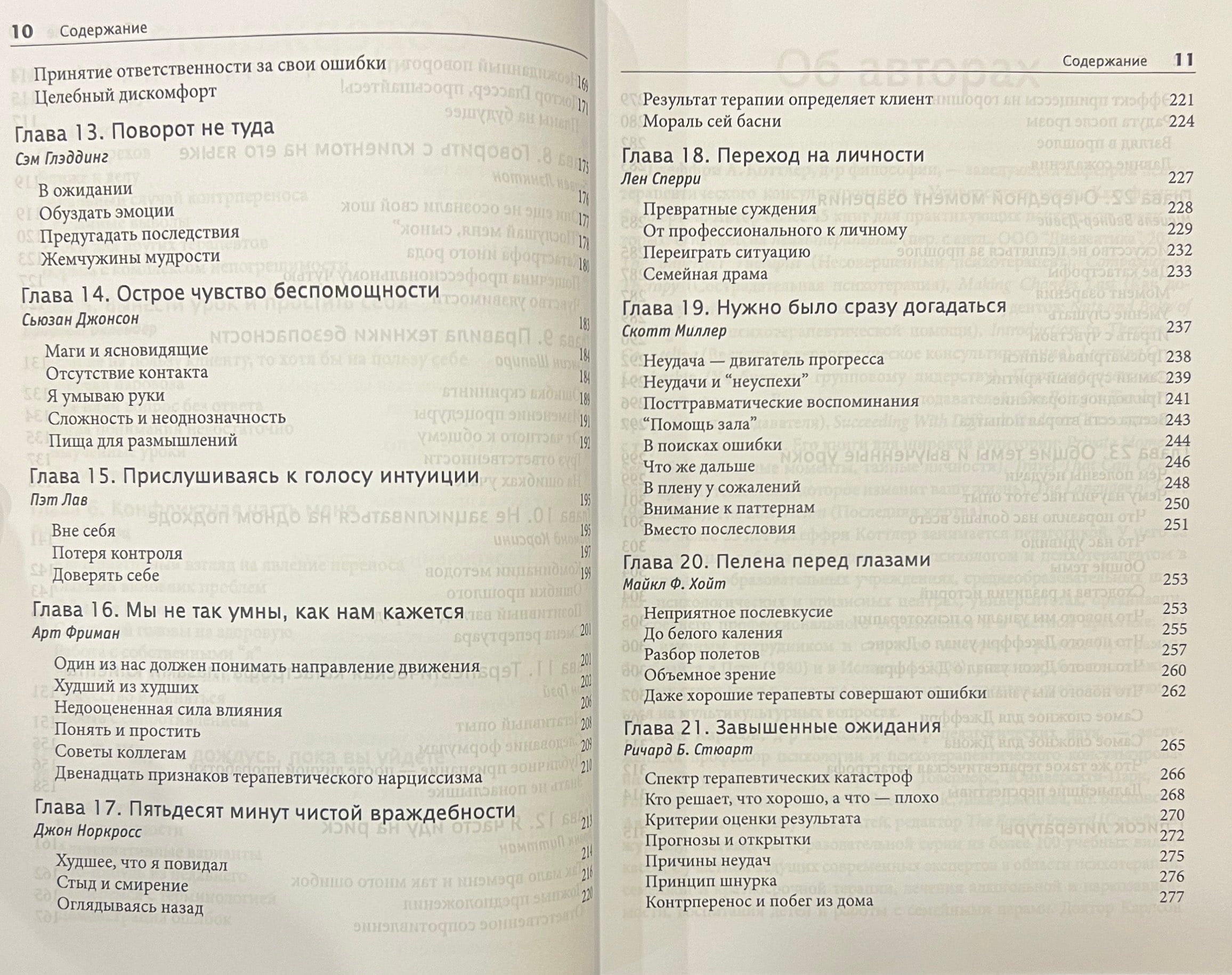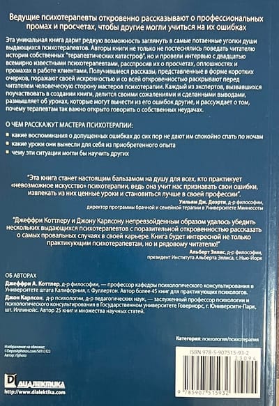 Написанная в увлекательном ключе, живым и легким языком, книга будет интересна не только практикующим психотерапевтам, но и рядовому читателю. Эта уникальная книга дарит редкую возможность заглянуть в самые потаенные уголки души выдающихся психотерапевтов. Авторы книги не только не постеснялись поведать читателю истории собственных «терапевтических катастроф», но и провели интервью с двадцатью всемирно известными психотерапевтами, расспросив их о просчетах, оплошностях и промахах в работе клиентами.