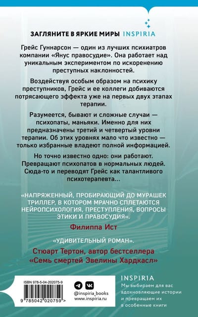 Грейс Гуннарсон – один из лучших психиатров компании «Янус правосудие». Она работает над уникальным экспериментом по искоренению преступных наклонностей. Воздействуя особым образом на психику преступников, Грейс и ее коллеги добиваются потрясающего эффекта уже на первых двух этапах терапии.