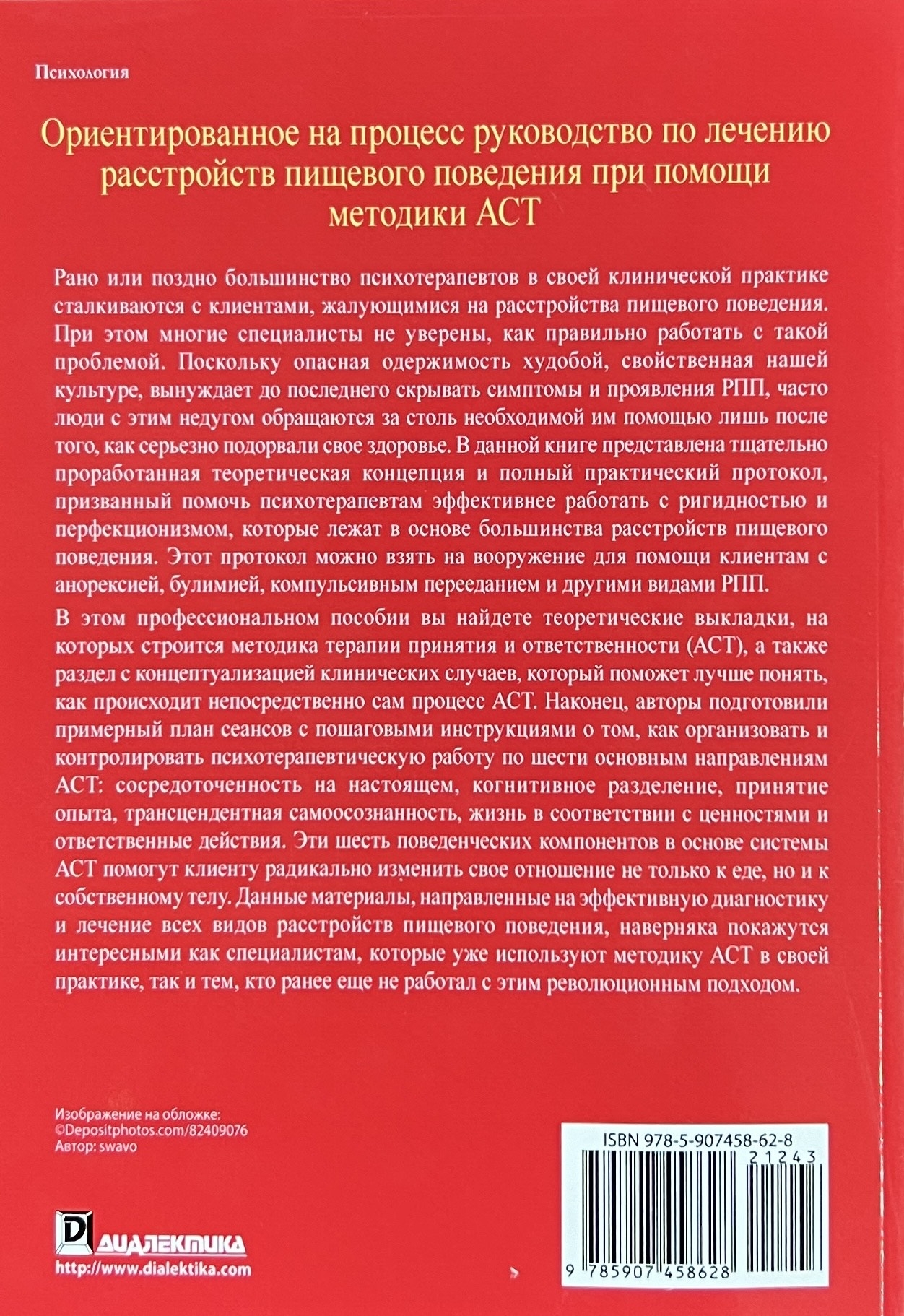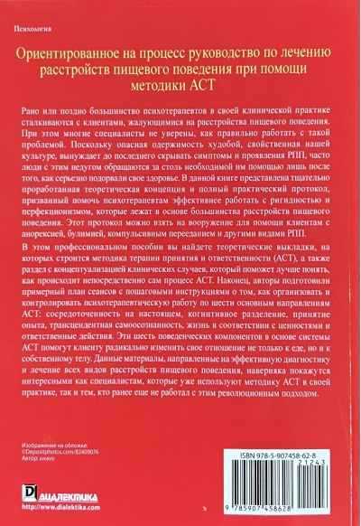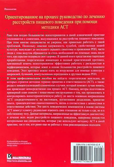 Данное пособие, предназначенное для профессиональных психотерапевтов, посвящено применению системы терапии принятия и ответственности (ACT) при расстройствах пищевого поведения (РПП). Книга пригодится тем, кто уже практикует данную методику, и тем, кто еще не работал с направлением ACT, но желает его освоить. В книге представлены теоретические концептуальные основы, на которых строится методика ACT, и прикладные рекомендации для специалистов. Более того, здесь вы найдете полный практический протокол и примерный план сеансов, который поможет сразу применять новую методику в работе с этой специфической разновидностью расстройств. Рано или поздно большинство психотерапевтов в своей клинической практике сталкиваются с клиентами, жалующимися на расстройства пищевого поведения. При этом многие специалисты не уверены, как правильно работать с такой проблемой. Поскольку опасная одержимость худобой, свойственная нашей культуре, вынуждает до последнего скрывать симптомы и проявления РПП, часто люди с этим недугом обращаются за столь необходимой им помощью лишь после того, как серьезно подорвали свое здоровье. В данной книге представлена тщательно проработанная теоретическая концепция и полный практический протокол, призванный помочь психотерапевтам эффективнее работать с ригидностью и перфекционизмом, которые лежат в основе большинства расстройств пищевого поведения. Этот протокол можно взять на вооружение для помощи клиентам с анорексией, булимией, компульсивным перееданием и другими видами РПП. В этом профессиональном пособии вы найдете теоретические выкладки, на которых строится методика терапии принятия и ответственности (ACT), а также раздел с концептуализацией клинических случаев, который поможет лучше понять, как происходит непосредственно сам процесс ACT. Наконец, авторы подготовили примерный план сеансов с пошаговыми инструкциями о том, как организовать и контролировать психотерапевтическую работу по шести основным направлениям ACT: сосредоточенность на настоящем, когнитивное разделение, принятие опыта, трансцендентная самоосознанность, жизнь в соответствии с ценностями и ответственные действия. Эти шесть поведенческих компонентов в основе системы ACT помогут клиенту радикально изменить свое отношение не только к еде, но и к собственному телу. Данные материалы, направленные на эффективную диагностику и лечение всех видов расстройств пищевого поведения, наверняка покажутся интересными как специалистам, которые уже используют методику ACT в своей практике, так и тем, кто ранее еще не работал с этим революционным подходом.