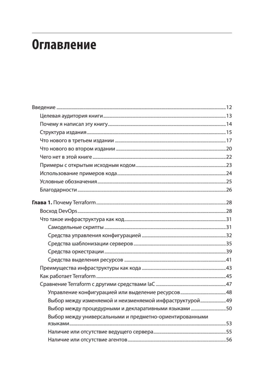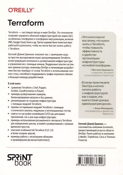 Terraform — настоящая звезда в мире DevOps. Эта технология позволяет управлять облачной инфраструктурой как кодом (IaC) на облачных платформах и платформах виртуализации, включая AWS, Google Cloud, Azure и др. Третье издание было полностью переработано и дополнено, чтобы вы могли быстро начать работу с Terraform. Евгений (Джим) Брикман знакомит вас с примерами кода на простом декларативном языке программирования Terraform, иллюстрирующими возможность развертывания инфраструктуры и управления ею с помощью команд. Умудренные опытом системные администраторы, инженеры DevOps и начинающие разработчики быстро перейдут от основ Terraform к использованию полного стека, способного поддерживать трафик огромного объема и большую команду разработчиков.