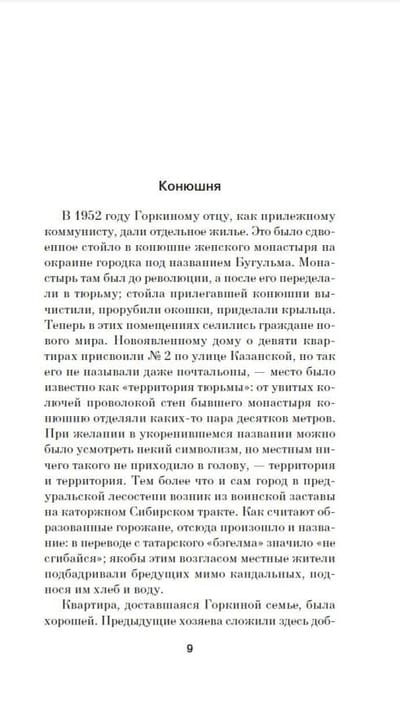 В 1952 году маленький Горка с родителями наконец переезжает в отдельное жилье. Квартира — на самом деле сдвоенное стойло в конюшне женского монастыря на окраине Бугульмы. Монастырь переделали в тюрьму, а стойла прилегавшей конюшни — в квартиры. Бугульма становится для Горки прообразом большого мира. Здесь он будет взрослеть, заводить друзей, влюбляться, делать глупости и совершать благородные поступки. «Территория тюрьмы» — именно так называют этот дом сами жители — в действительности становится для ребенка, а затем молодого взрослого местом, где он учится быть по-настоящему свободным.