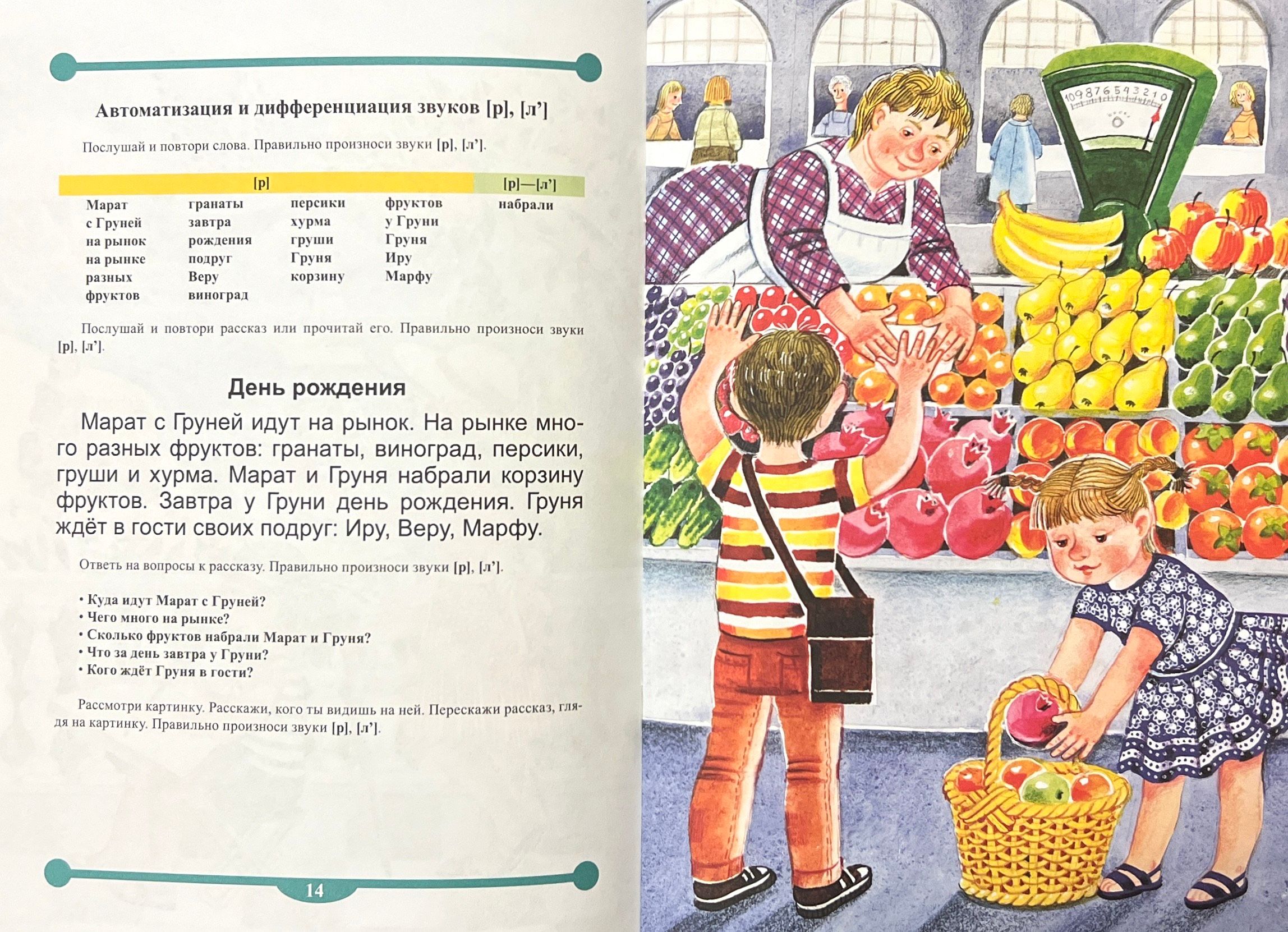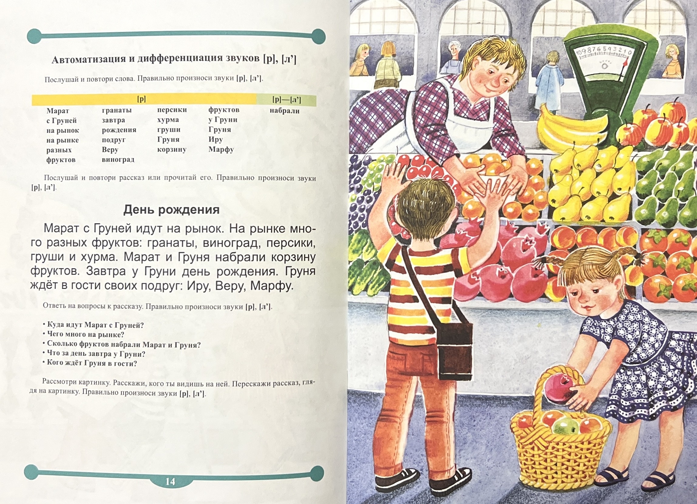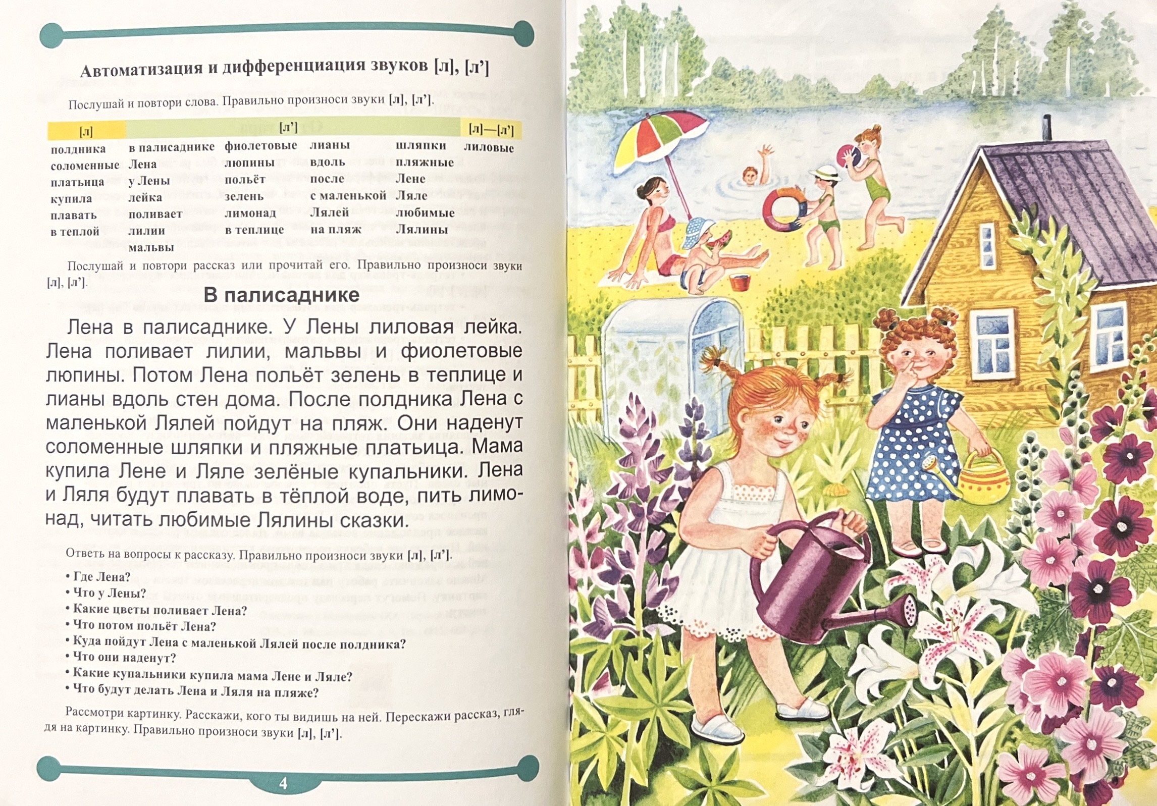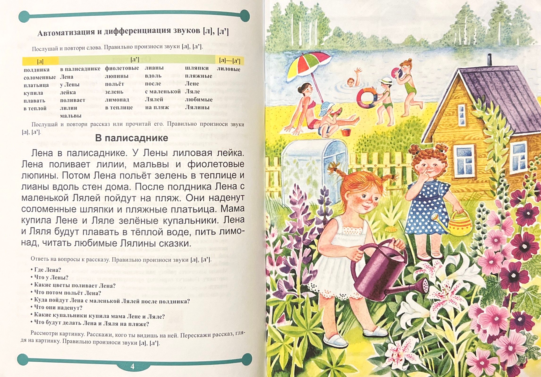 В тетради представлены тексты и картинки к ним для автоматизации и дифференциации сонорных звуков [р], [р'], [л], [л']. К каждому рассказу даны слова, произношение которых необходимо отработать до начала занятия по пересказу. Рассматривая картинку, ребенок рассказывает, что изображено на ней, и правильно произносит сонорные звуки. Завершает работу над текстом пересказ с опорой на картинку.