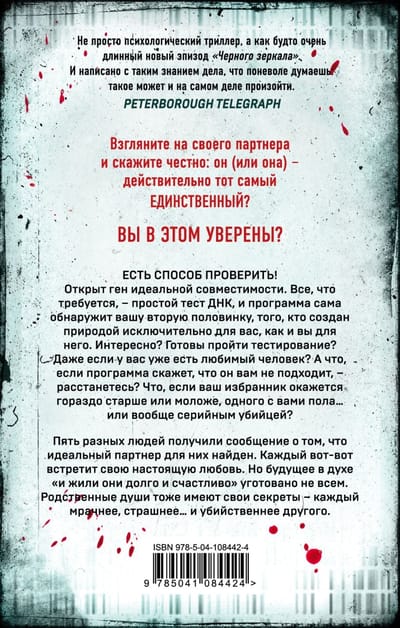 Есть способ проверить! Открыт ген идеальной совместимости. Все, что требуется, – простой тест ДНК, и программа сама обнаружит вашу вторую половинку, того, кто создан природой исключительно для вас, – как и вы для него. Интересно? Готовы пройти тестирование? Даже если у вас уже есть любимый человек? А что если программа скажет, что он вам не подходит, - расстанетесь? Что если ваш избранник окажется гораздо старше или моложе, одного с вами пола… или вообще серийным убийцей?
