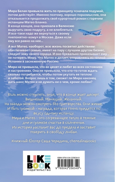 Мира Белая привыкла жить по принципу «сначала подумай, потом действуй». Именно поэтому, хорошо поразмыслив, она отказывается продолжать свой курортный роман с горячим испанцем Матео Бланко. В конце концов она приехала в Валенсию выручать свою подругу, а не влюбляться. И все-таки надо же вернуться к своему «непонятно-кому» в Москве. Даже если ему все равно на нее…