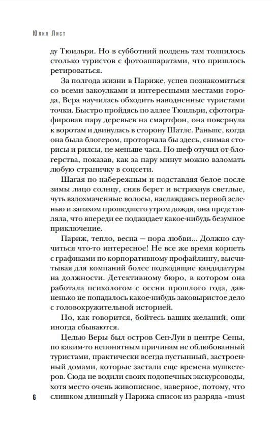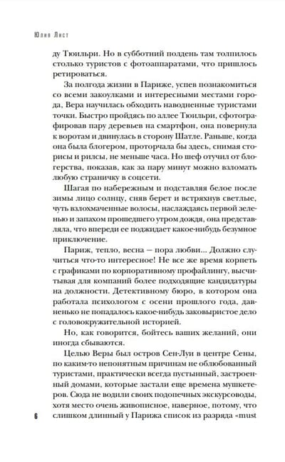 В остросюжетных романах Юлии Лист из серии «Следствие ведет профайлер» всегда присутствует битва интеллектов — яркий антагонист, делающий вызов главным героям. Легкость сочетается с интеллектуальностью, а научная канва — психология лжи — со светлой и беззаботной атмосферой жизни в европейской столице.