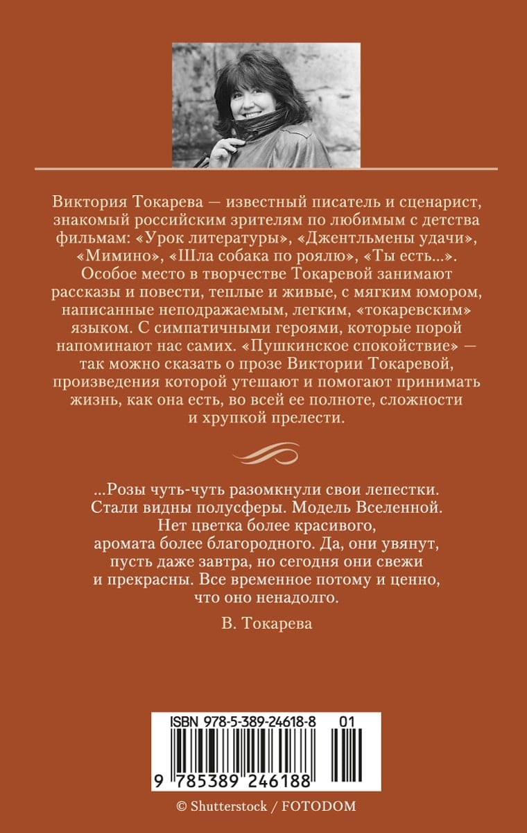 Виктория Токарева — известный писатель и сценарист, знакомый зрителям по любимым с детства фильмам: «Урок литературы», «Джентльмены удачи», «Мимино», «Шла собака по роялю», «Ты есть...». Особое место в творчестве Токаревой занимают рассказы и повести, теплые и живые, с мягким юмором, написанные неподражаемым, легким, «токаревским» языком. С симпатичными героями, которые порой напоминают нас самих. «Пушкинское спокойствие» — так можно сказать о прозе Виктории Токаревой, произведения которой утешают и помогают принимать жизнь, как она есть, во всей ее полноте, сложности и хрупкой прелести. В издание вошли прозаические произведения Виктории Токаревой, включая повести «Тихая музыка за стеной», «Ангел-хранитель», рассказы «Ни с тобой, ни без тебя», «Хрустальный башмачок», «Брат и сестра», «Короткие гудки» и др.