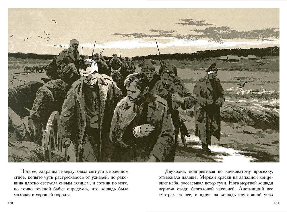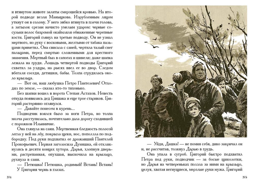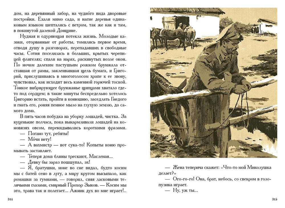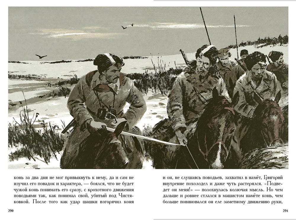 Действие романа «Тихий Дон» берет свое начало в последних предвоенных днях казачьего хутора. Вскоре мирная жизнь останется в прошлом: она будет разрушена битвой с внешним, иноземным, врагом — в Первой Мировой войне, затем со своими же соседями, родственниками, вчерашними друзьями — в Гражданской. Главный герой романа, Григорий Мелехов, готовил себя к мирной семейной жизни и труду, но судьба отрывает его от дома и кидает в водоворот трагических событий. Много лет он проводит на линии фронта, пытаясь отыскать во всем происходящем смысл и цель, — но ни на чьей стороне не может найти себе места. В этом расколотом мире нет правых. Смысл жизни сохраняется в родных и близких, держится в пронзительной истории любви Григория, но и самых дорогих людей судьба отнимает у него одного за другим. Главный эпос XX века публикуется с иллюстрациями Юрия Реброва.