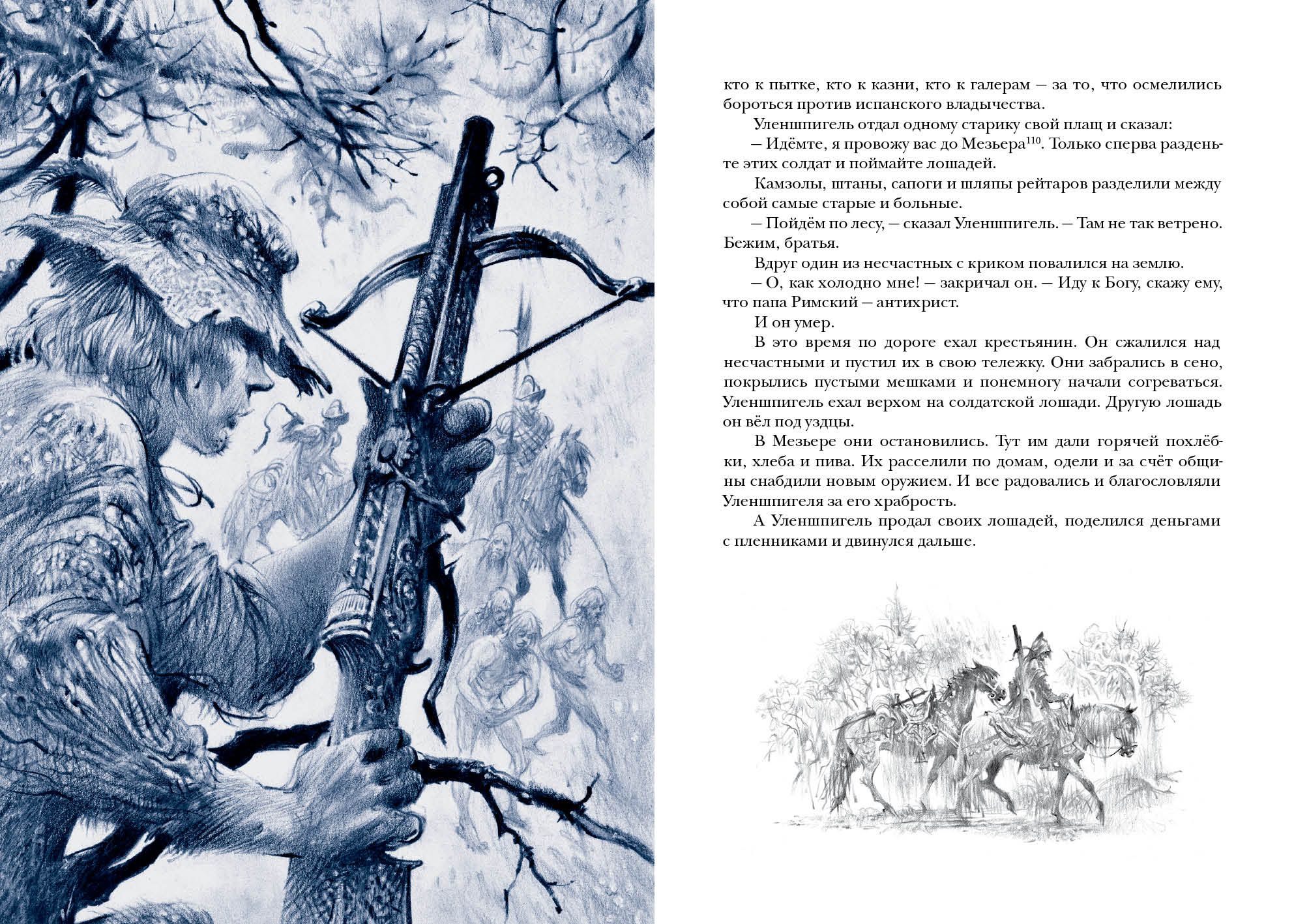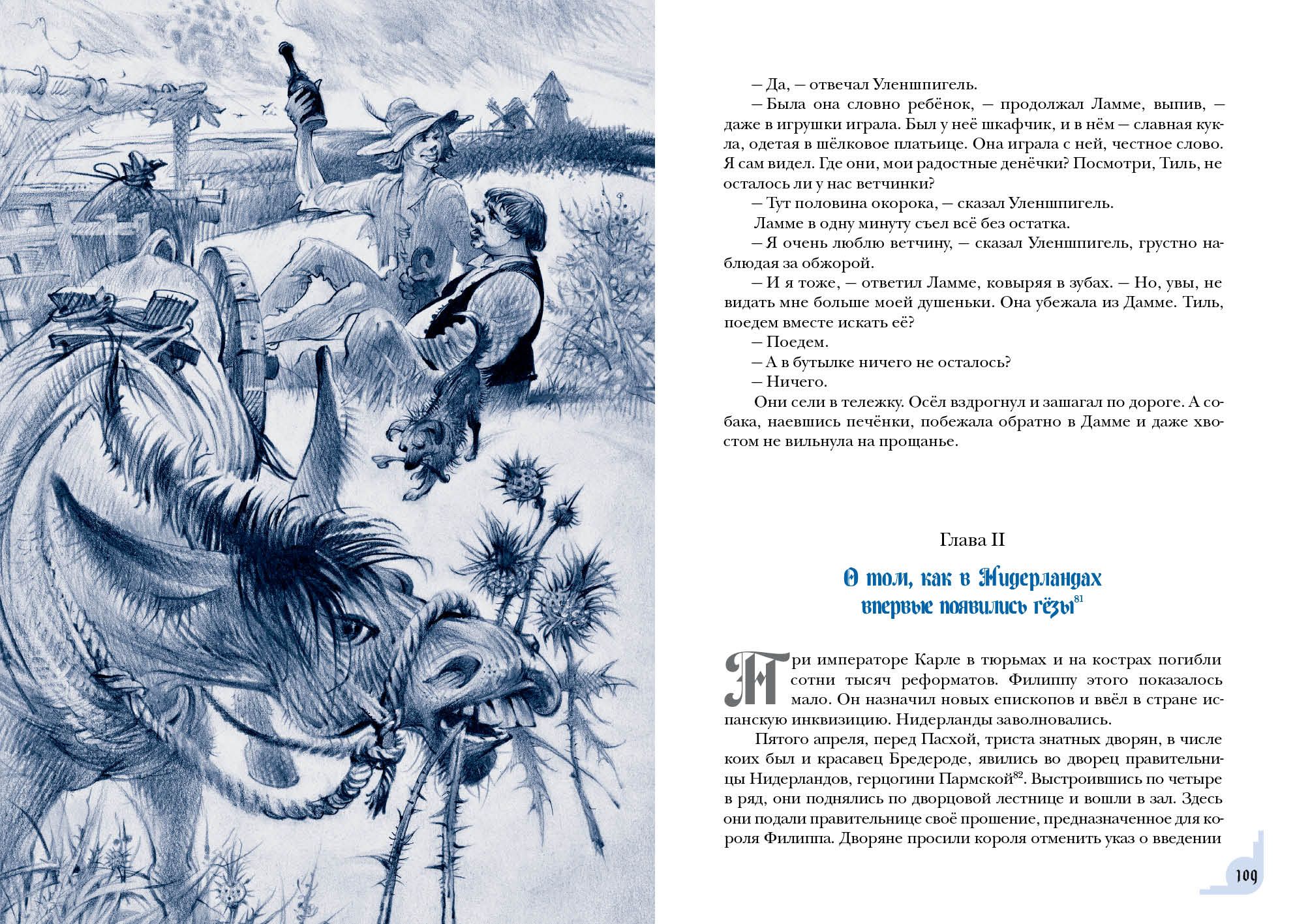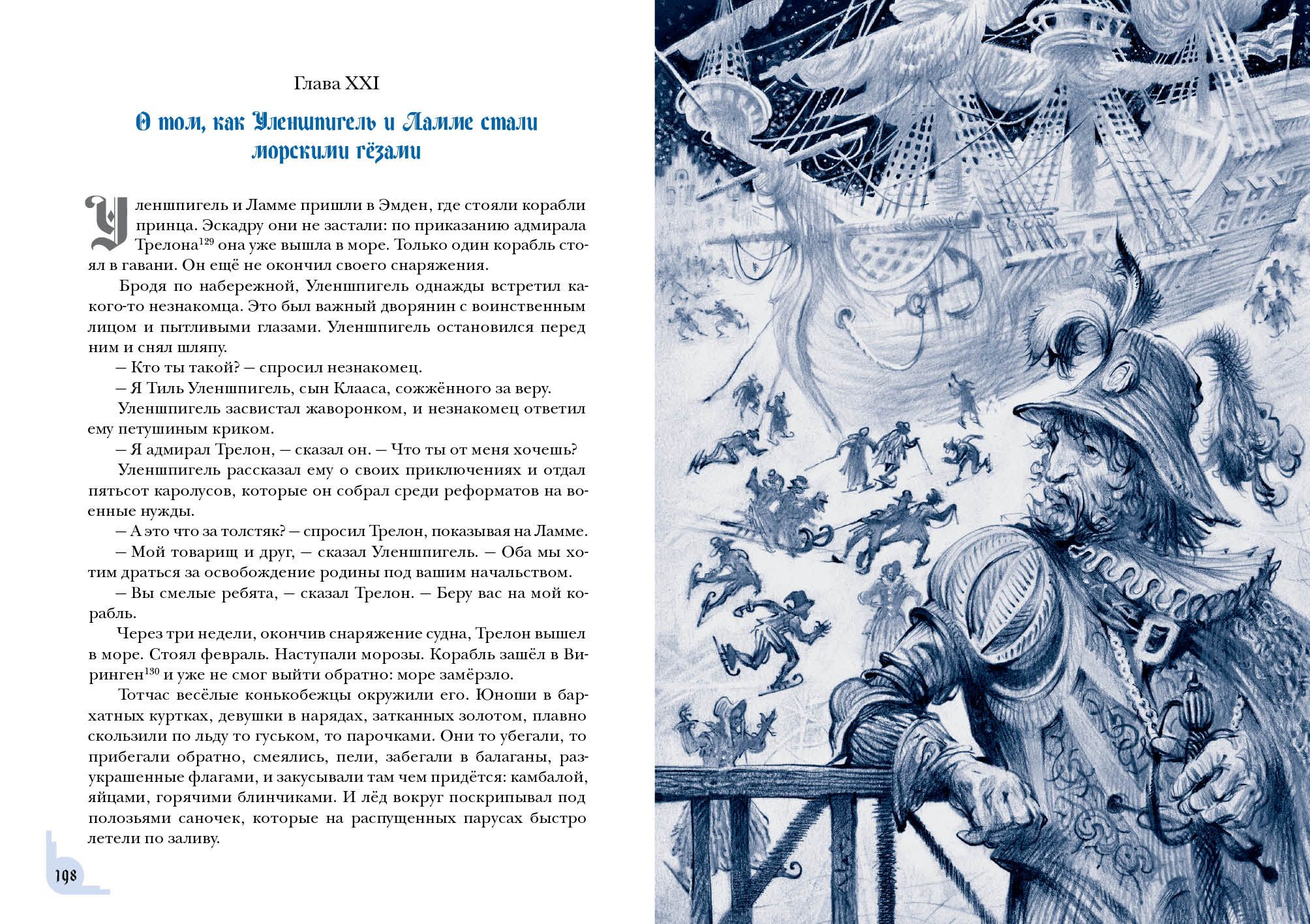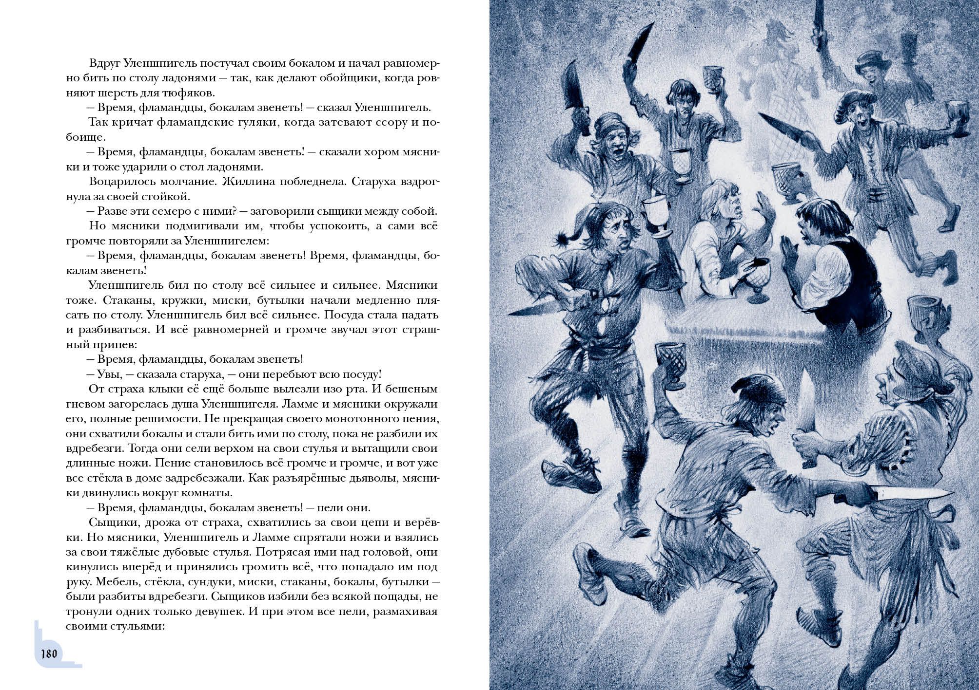 Знаменитый роман бельгийского писателя Шарля де Костера о приключениях хитроумного весельчака Тиля Уленшпигеля не только прославил своего автора, но и вошёл в золотой фонд мировой литературы. В романе отражены события, происходившие в XVI веке, когда гордая Фландрия находилась под властью Испании и страдала от жестокости католической инквизиции. Юный Тиль Уленшпигель — шутник и проказник, но с добрым сердцем и благородной душой. Родился он в семье угольщика Клааса в один год с будущим испанским королём Филиппом II, бессердечным тираном. Родители Тиля мирно жили и честно трудились, но однажды страшная беда пришла в их дом — и юноша принял решение бороться за свою родину, спасти её от гнёта испанцев. Вместе со своим верным другом Ламме Гудзаком он отправляется странствовать по Фландрии и со временем становится умелым воином, но не теряет при этом благородства и остроумия. Насмешник Уленшпигель сражается с испанскими захватчиками, наказывает чванливых дворян, спасает пленников, участвует в морских битвах и даже становится капитаном корабля.  Книга проиллюстрирована реалистичными графическими работами Юрия Богачёва