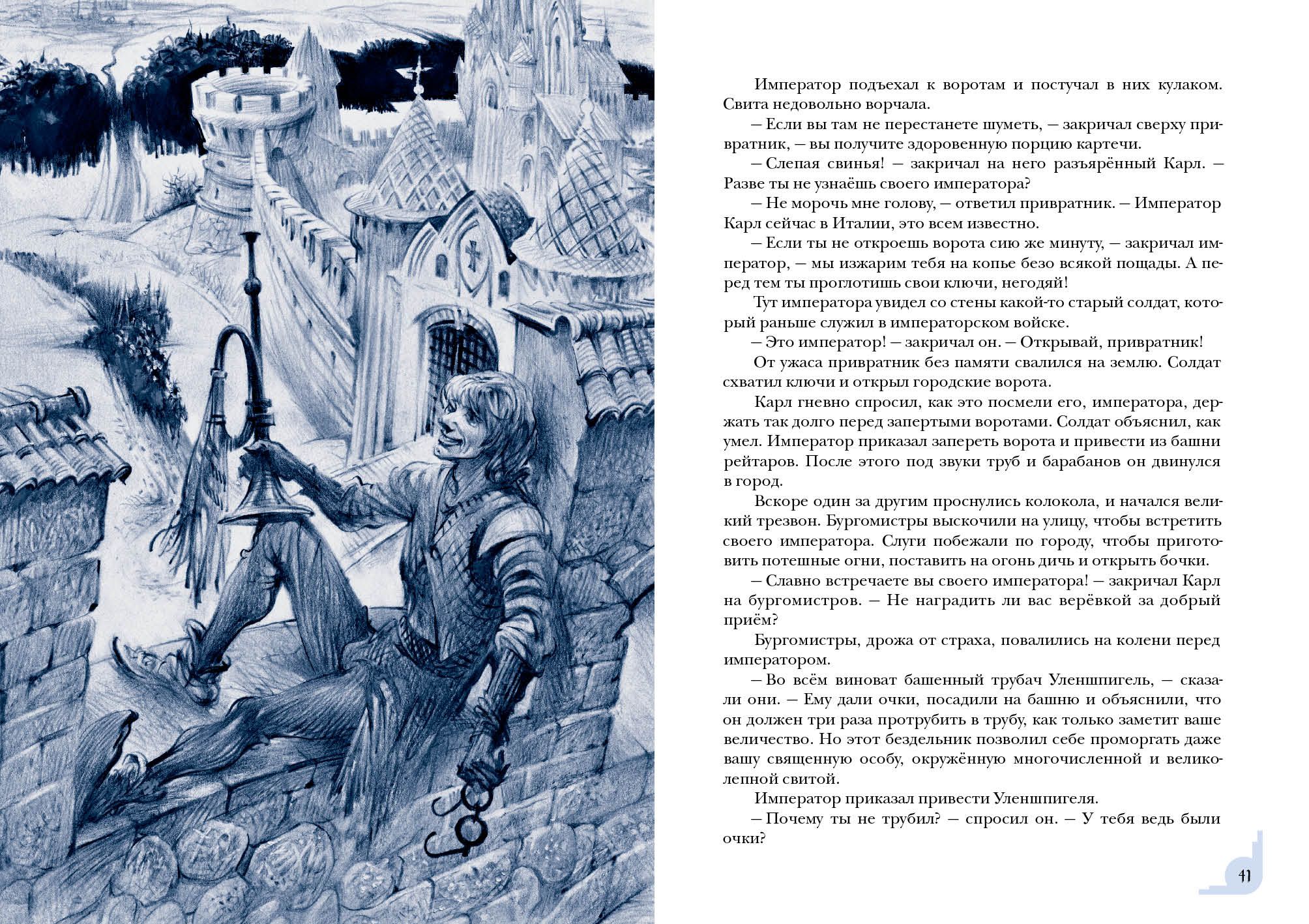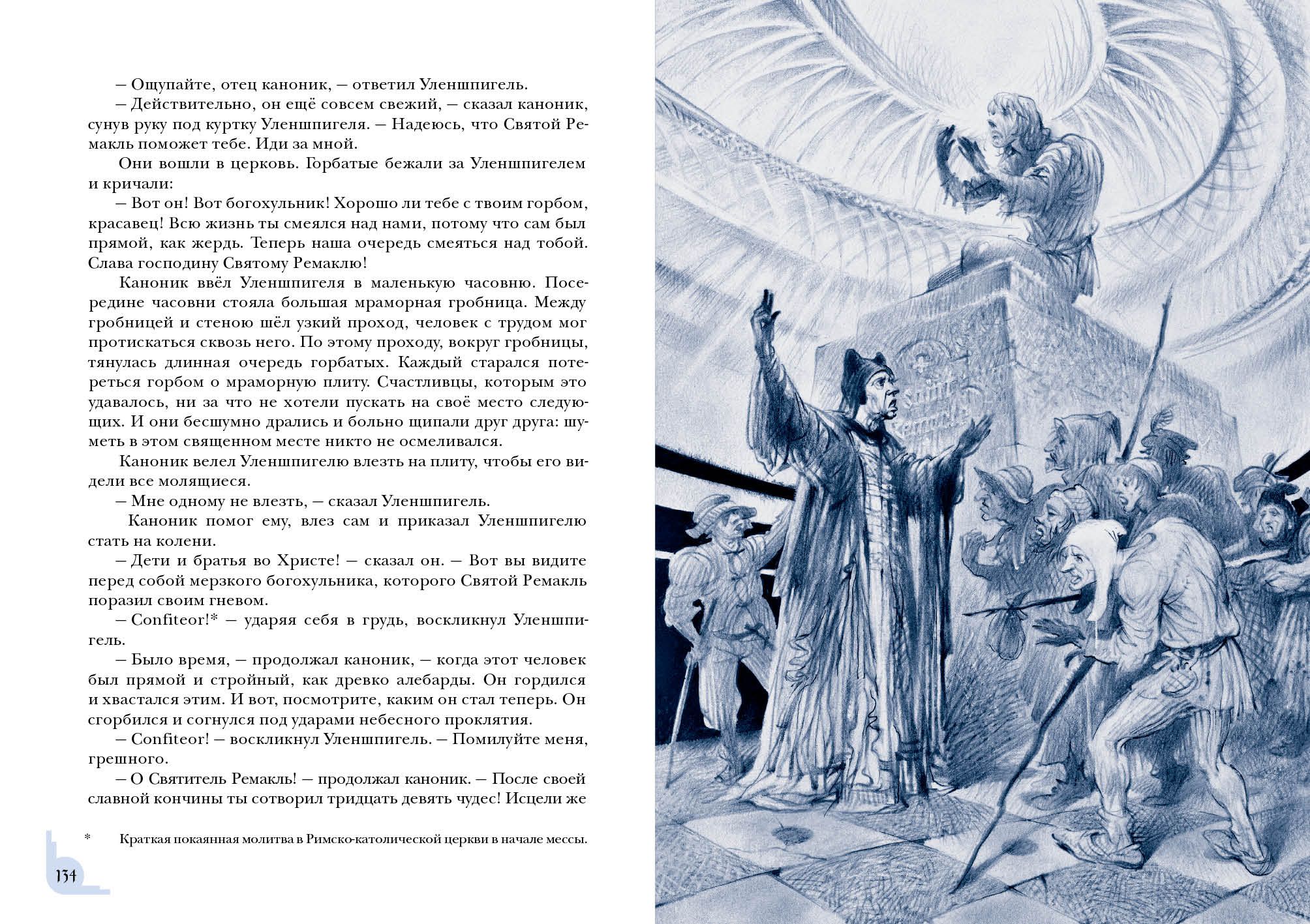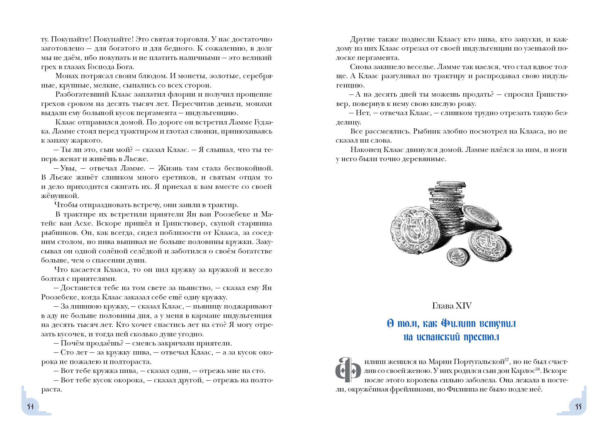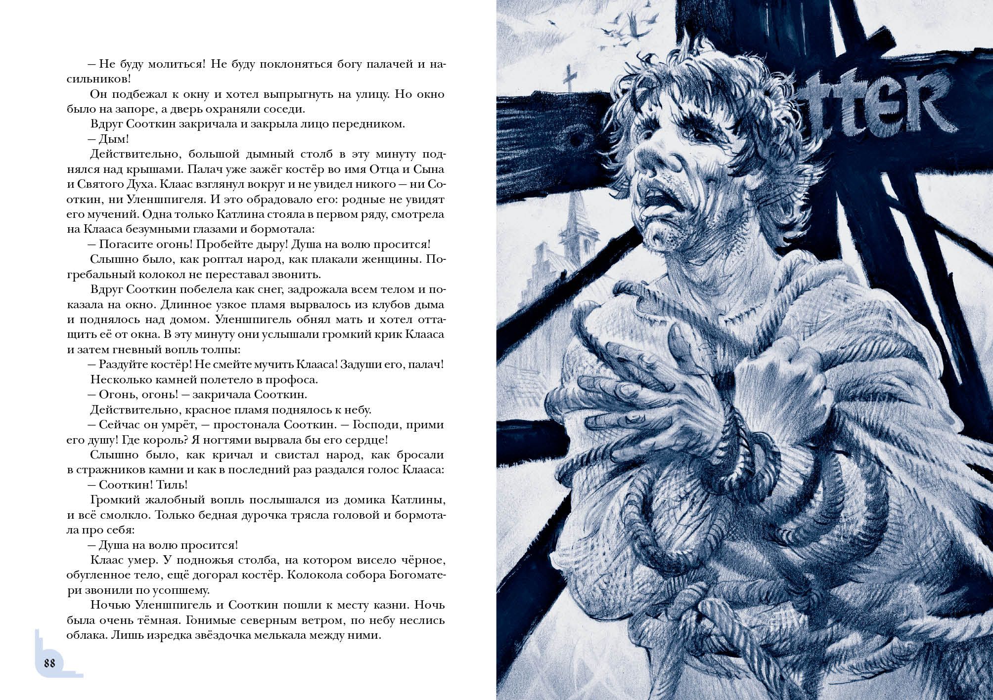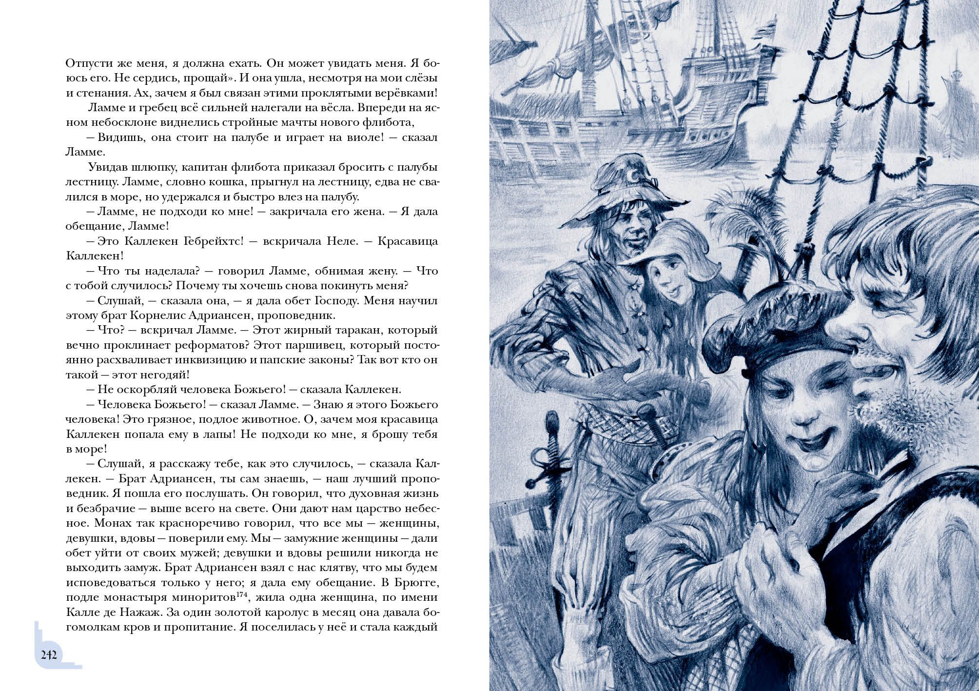 Знаменитый роман бельгийского писателя Шарля де Костера о приключениях хитроумного весельчака Тиля Уленшпигеля не только прославил своего автора, но и вошёл в золотой фонд мировой литературы. В романе отражены события, происходившие в XVI веке, когда гордая Фландрия находилась под властью Испании и страдала от жестокости католической инквизиции. Юный Тиль Уленшпигель — шутник и проказник, но с добрым сердцем и благородной душой. Родился он в семье угольщика Клааса в один год с будущим испанским королём Филиппом II, бессердечным тираном. Родители Тиля мирно жили и честно трудились, но однажды страшная беда пришла в их дом — и юноша принял решение бороться за свою родину, спасти её от гнёта испанцев. Вместе со своим верным другом Ламме Гудзаком он отправляется странствовать по Фландрии и со временем становится умелым воином, но не теряет при этом благородства и остроумия. Насмешник Уленшпигель сражается с испанскими захватчиками, наказывает чванливых дворян, спасает пленников, участвует в морских битвах и даже становится капитаном корабля.  Книга проиллюстрирована реалистичными графическими работами Юрия Богачёва