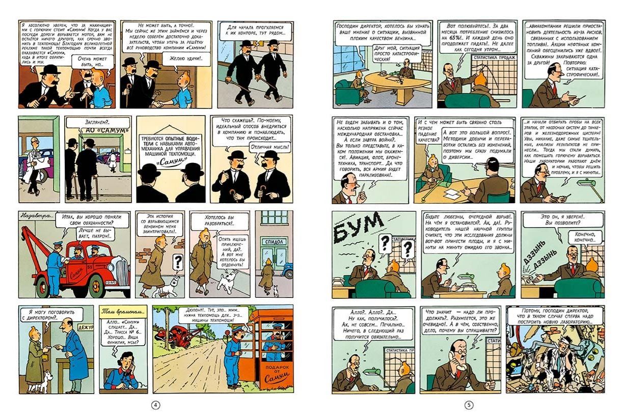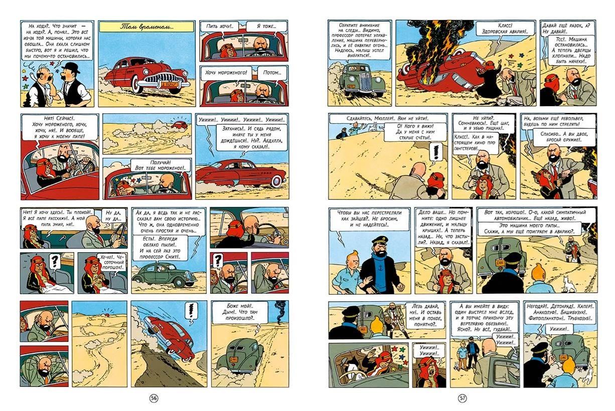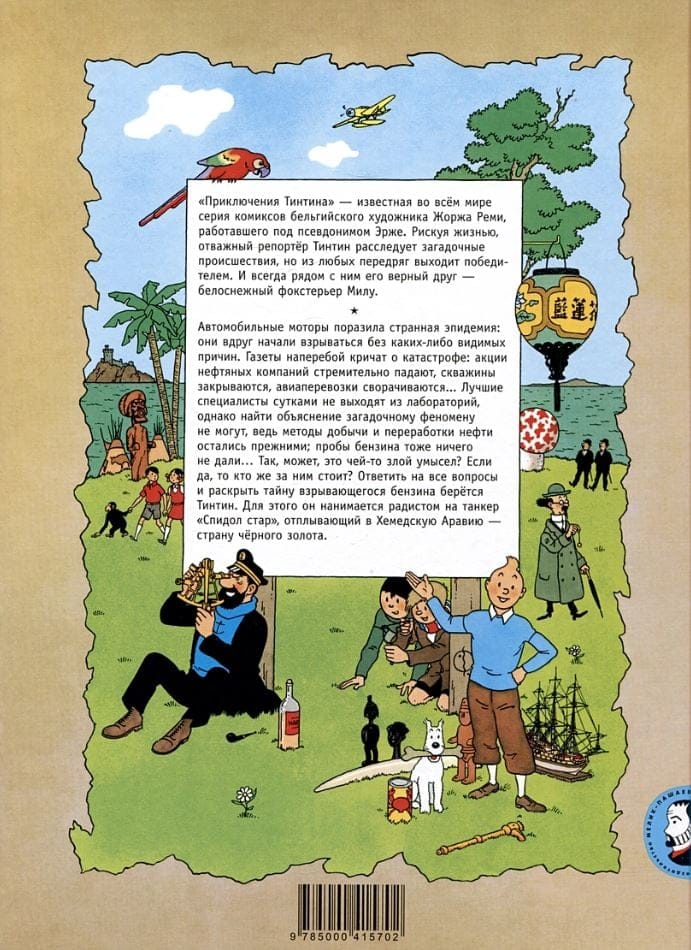 Автомобильные моторы поразила странная эпидемия: они вдруг начали взрываться без каких-либо видимых причин. Газеты наперебой кричат о катастрофе: акции нефтяных компаний стремительно падают, скважины закрываются, авиаперевозки сворачиваются из-за плохого качества топлива… Специалисты сутками не выходят из лабораторий, однако найти объяснение загадочному феномену не могут, ведь методы добычи и переработки нефти остались прежними; пробы горючего тоже ничего не дали… Так, может, это чей-то злой умысел? Если да, то кто же за ним стоит? Ответить на все вопросы и раскрыть тайну взрывающегося бензина берется Тинтин. Для этого он нанимается радистом на танкер «Спидол стар», отплывающий в Хемедскую Аравию – страну черного золота.