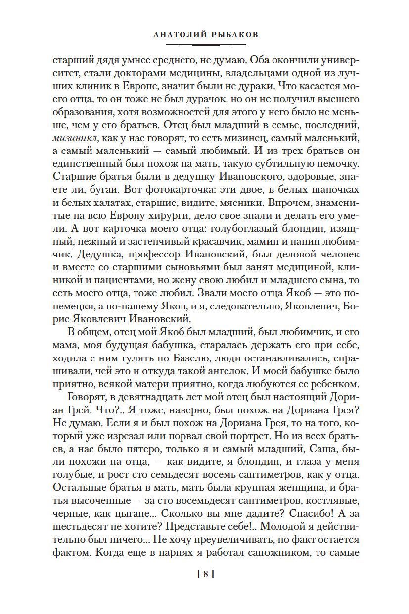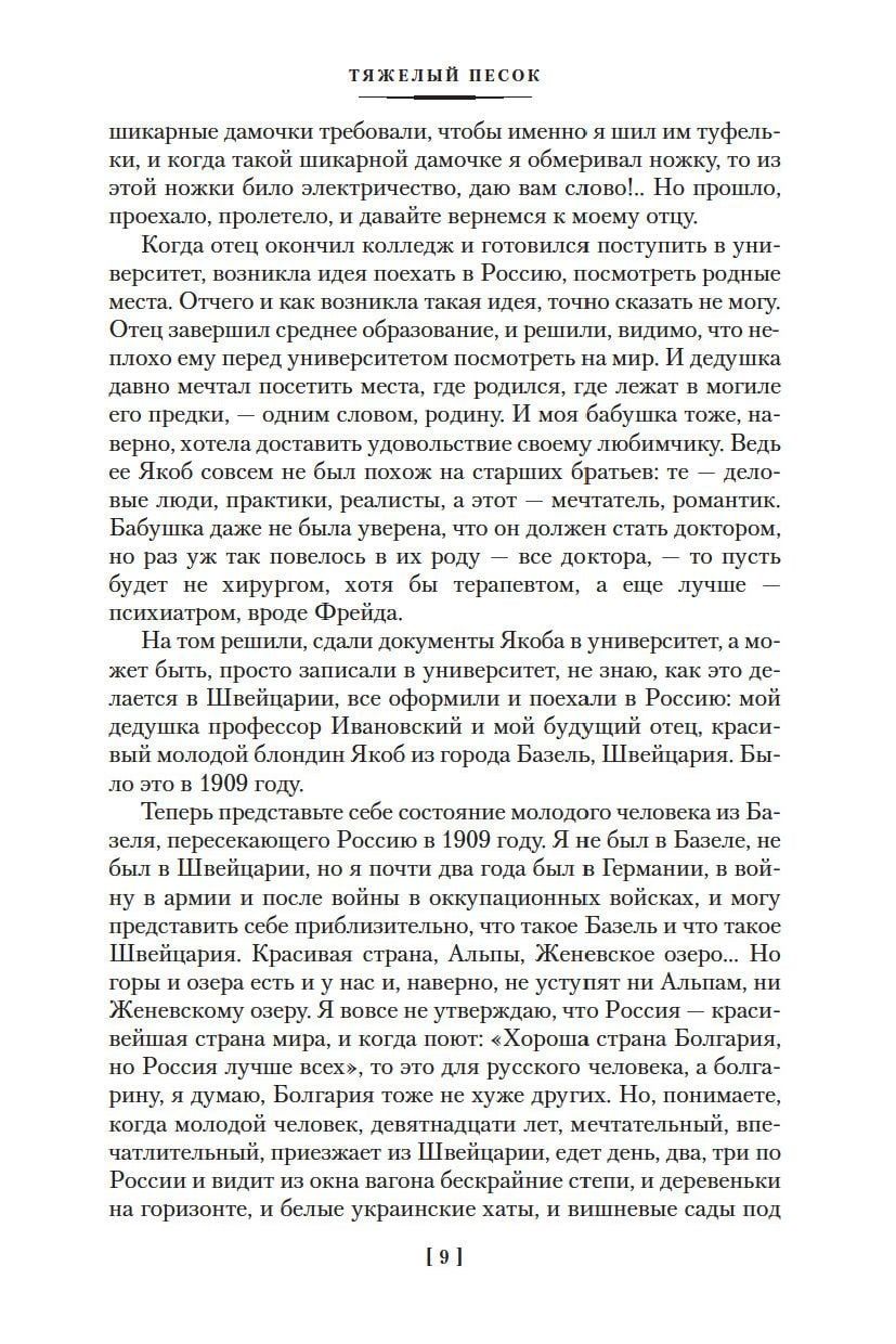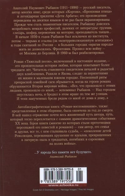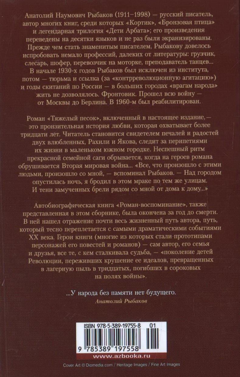 Анатолий Наумович Рыбаков — русский писатель, автор многих книг, среди которых «Кортик», «Бронзовая птица» и легендарная трилогия «Дети Арбата»; его произведения переведены на десятки языков и не раз были экранизированы. Роман «Тяжелый песок», включенный в настоящее издание, — это пронзительная история любви, которая охватывает более тридцати лет. Читатель становится свидетелем печалей и радостей двух влюбленных, Рахили и Якова, следит за перипетиями их жизни в маленьком южном городке. Неспешный ритм прекрасной семейной саги обрывается, когда на героев романа обрушивается Вторая мировая война… «Все, что произошло с этими людьми, произошло со мной, — вспоминал Рыбаков. — Над городом опустилась ночь, я бродил в этом мраке по тем же улицам. И тени замученных брели рядом со мной от дома к дому...» Автобиографическая книга «Роман-воспоминание», также представленная в этом сборнике, была окончена за год до смерти. В ней нашел отражение почти весь жизненный путь автора, путь, который тесно переплетается с самыми драматическими событиями XX века. Герои книги (многие из которых стали прототипами персонажей его повестей и романов) — сам автор, его семья и друзья, все те, с кем сталкивала судьба, «поколение детей Революции, переживших крушение ее идеалов, превращенных в лагерную пыль в тридцатых, погибших в сороковых на полях войны».