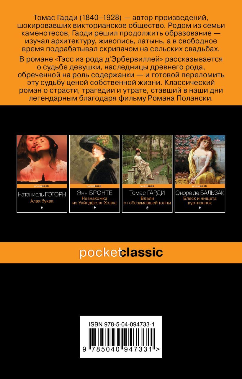 Классический роман о страсти, трагедии и утрате, ставший в наши дни легендарным благодаря фильму Романа Полански. Тэсс — веселая, скромная и нежная девушка. Милая и привлекательная. Поруганная и загубленная. Сможет ли она осуществить мечты после того, как совершила «грех» не по своей воле? Или предрассудки общества приведут ее к краху? И почему она должна платить не за свою вину? Тяжело поворачивать свою жизнь вспять, но еще тяжелее приходится тому, кто уже совершил поворот и видит, что судьба не содействует ему, а, напротив, глумится над его робкими шагами по новому пути.