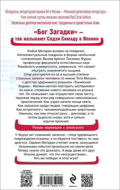 Тайна, пропитанная безумием. Киёси Митараи вызван на поединок. Интеллектуальный поединок в форме необычной головоломки. Вызов бросил Такэхико Фуруи, профессор факультета естественных наук Токийского университета, уверенный, что сможет обыграть знаменитого сыщика. Спор разгорелся из-за в высшей степени странных записок человека по имени Тота Мисаки, с детства одержимого романом «Токийский Зодиак». Мисаки мечтал повторить эксперимент из книги: сложение нового человека из разных тел. Он описывает, как осуществил свою мечту, пережив перед этим ряд совершенно невозможных приключений. Как узрел начало конца света. Как оказался среди людей, говорящих цифрами. Как встретился с человекоподобными животными. Наконец, как ему откусил руку… динозавр, а та потом выросла снова, хотя и сильно короче прежней. У Фуруи нет сомнений: записки — плод чудовищного повреждения психики, и он берется поставить по ним диагноз. Однако Митараи считает иначе: кажущиеся безумными события произошли на самом деле. Теперь нужно это доказать. А ведь даже его друг Исиока думает, что это неосуществимо… Кто же победит в этой игре? «Бог Загадки» — так называют Содзи Симаду в Японии. Обладатель литературной премии № 1 в Японии — «Японской детективной литературы». Член элитной группы японских писателей Red Circle Authors. Несколько десятков миллионов книг, проданных в одной только Азии.
