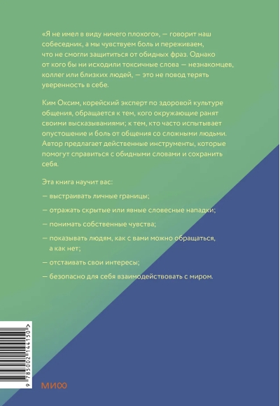 Ким Оксим, корейский эксперт по здоровой культуре общения, обращается к тем, кого окружающие ранят своими высказываниями, кто часто испытывает опустошение и боль от общения со сложными людьми. Автор предлагает действенные инструменты, которые помогут справиться с обидными словами и сохранить себя.