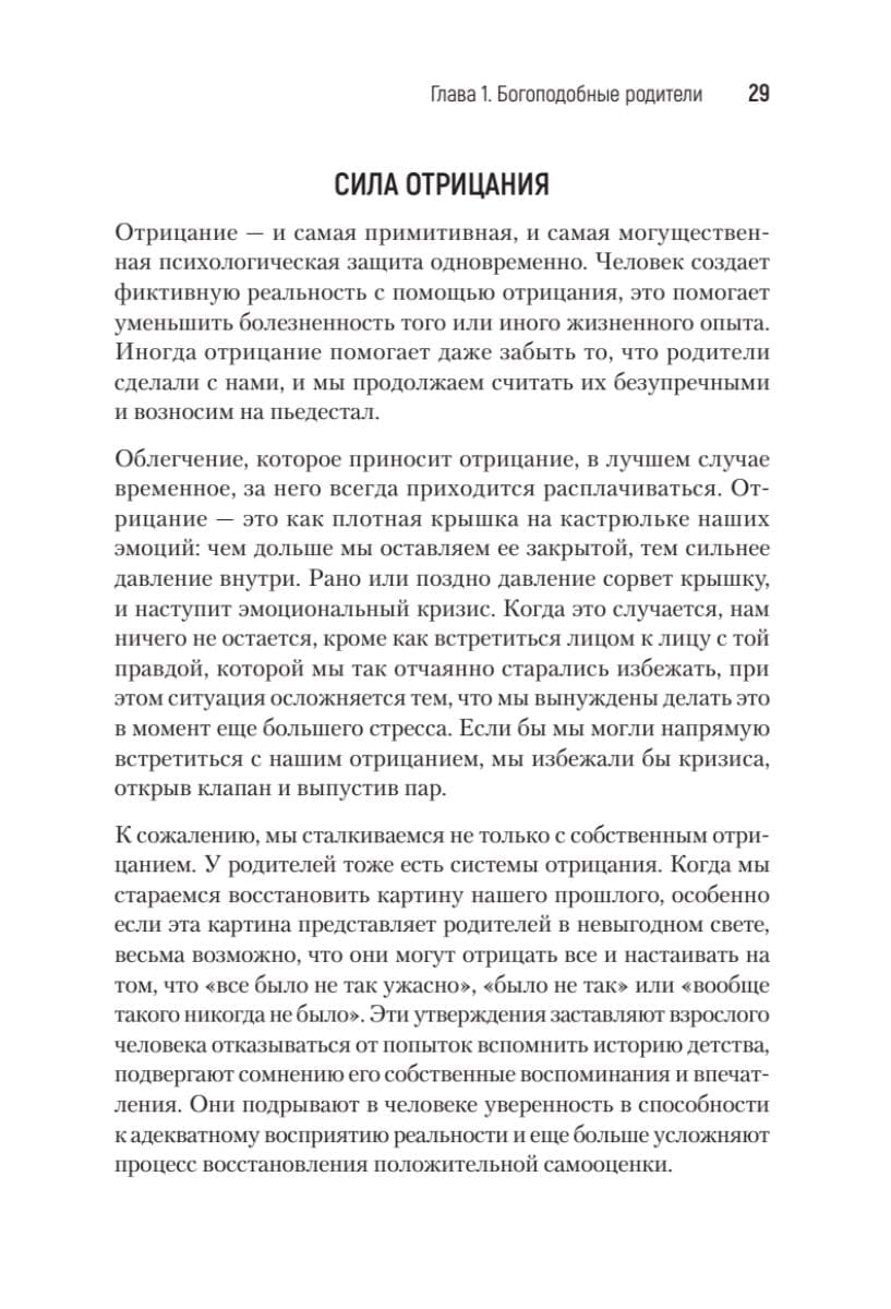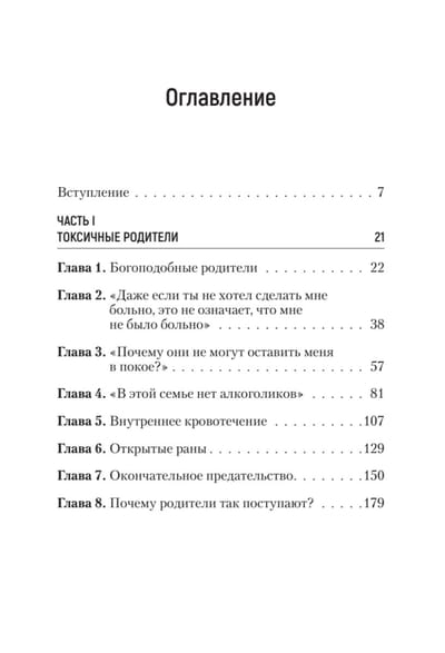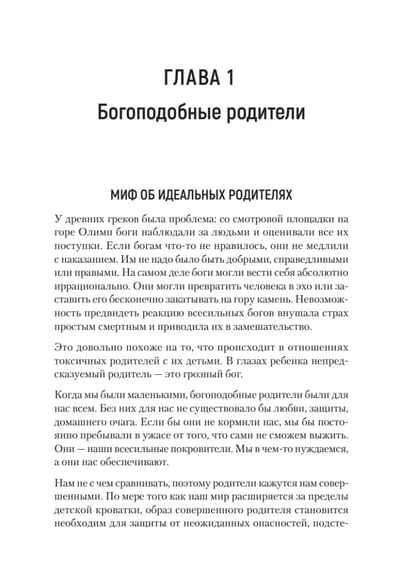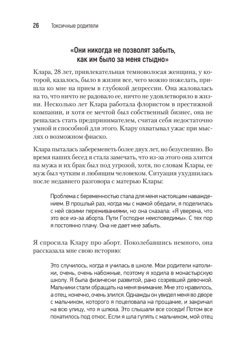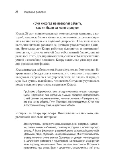 Все (или почти все) родители время от времени не оправдывают наших ожиданий. Однако Сьюзан Форвард не смягчает ударов, когда речь заходит о людях, чьи недостатки наносят тяжелую психологическую травму детям. Ее живая, откровенная книга помогает свести на нет родительские манипуляции авторитетом, чувством вины и прочими «убийцами» чувства собственного достоинства. Эта книга для всех, кто хочет справиться с болью детства, а главное, идти дальше, выйти за рамки паттернов разочаровывающих взаимоотношений, укоренившихся в родительском доме. Не надо винить себя за то, что было с вами в прошлом. Вы можете изменить свою жизнь прямо сейчас! Достаточно прочесть эту книгу, и вам откроется совершенно новый мир — мир уверенности в себе, эмоциональной независимости и большой внутренней силы.