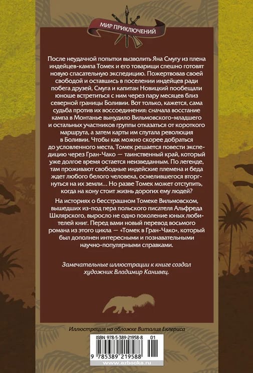 После неудачной попытки вызволить Яна Смугу из плена индейцев-кампа Томек и его товарищи спешно готовят новую спасательную экспедицию. Пожертвовав своей свободой и оставшись в поселении индейцев ради побега друзей, Смуга и капитан Новицкий пообещали юноше встретиться с ним через пару месяцев близ северной границы Боливии. Вот только, кажется, сама судьба против их воссоединения: сначала восстание кампа в Монтанье вынудило Вильмовского-младшего и остальных участников группы отказаться от короткого маршрута, а затем карты им спутала революция в Боливии. Чтобы как можно скорее добраться до условленного места, Томек решается повести экспедицию через Гран-Чако — таинственный край, который уже долгое время остается неизведанным. По легенде, там проживают свободные индейские племена и беда ждет любого белого человека, осмелившегося вторгнуться на их земли… Но разве Томек может отступить, когда на кону стоит жизнь дорогих ему людей? На историях о бесстрашном Томеке Вильмовском, вышедших из-под пера польского писателя Альфреда Шклярского, выросло не одно поколение юных любителей книг. Перед вами новый перевод восьмого романа из этого цикла — «Томек в Гран-Чако», который был дополнен интересными и познавательными научно-популярными справками. Замечательные иллюстрации к книге создал художник Владимир Канивец.