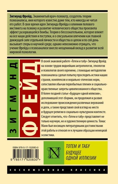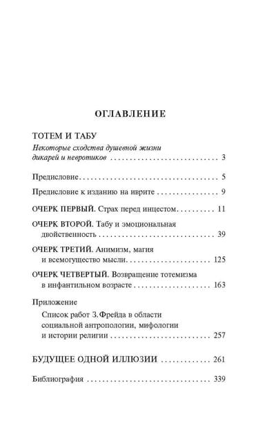 В своей знаковой работе «‎Тотем и табу»‎ Зигмунд Фрейд на основе трудов виднейших антропологов, этнологов и психологов своего времени, с помощью методологии психоанализа сделал попытку проследить истоки наших страхов, комплексов и морально этических норм, сопоставляя обычаи первобытных племен и социально-нравственные запреты цивилизованного общества. В более поздней статье, «‎Будущее одной иллюзии»‎, дополнившей этот сборник, он продолжил и развил исследование происхождения различных верований и догм, а также представил свой взгляд на место и будущее религии в социально-культурном контексте.