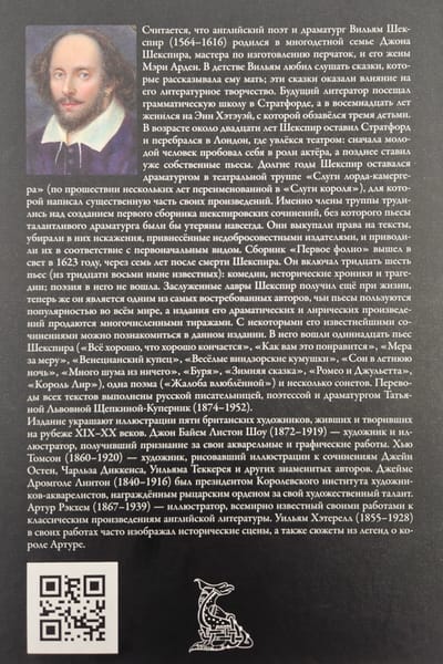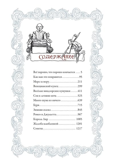 В данный сборник вошли одиннадцать пьес Шекспира, одна поэма и несколько его сонетов. Переводы всех текстов выполнены русской писательницей, поэтессой и драматургом Татьяной Львовной Щепкиной-Куперник (1874–1952). Издание украшают иллюстрации британских художников, которые жили и творили на рубеже XIX–XX веков: Джона Байема Листона Шоу (1872–1919), Хью Томсона (1860–1920), Джеймса Дромголе Линтона (1840–1916), Артура Рэкхема (1867–1939) и Уильяма Хатерелла (1855–1928).