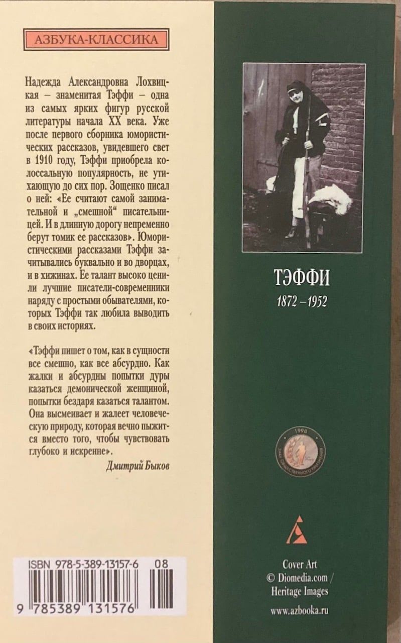Надежда Александровна Лохвицкая — знаменитая Тэффи — одна из самых ярких фигур русской литературы начала XX века. Уже после первого сборника юмористических рассказов, увидевшего свет в 1910 году, Тэффи приобрела колоссальную популярность, не утихающую до сих пор. Зощенко писал о ней: «Ее считают самой занимательной и «смешной» писательницей. И в длинную дорогу непременно берут томик ее рассказов». Юмористическими рассказами Тэффи зачитывались буквально и во дворцах, и в хижинах. Ее талант высоко ценили лучшие писатели-современники наряду с простыми обывателями, которых Тэффи так любила выводить в своих историях.