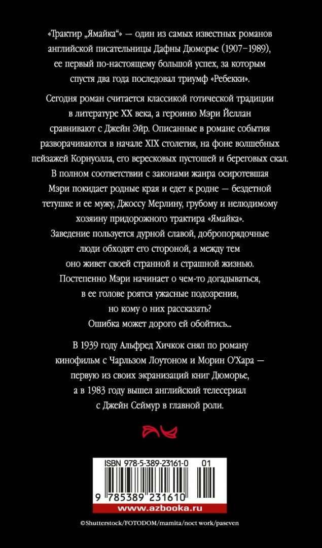 «Трактир «Ямайка» — один из самых известных романов английской писательницы Дафны Дюморье (1907–1989), ее первый по-настоящему большой успех, за которым спустя два года последовал триумф «Ребекки». Сегодня роман считается классикой готической традиции в литературе XX века, а героиню Мэри Йеллан сравнивают с Джейн Эйр. Описанные в романе события разворачиваются в начале XIX столетия, на фоне волшебных пейзажей Корнуолла, его вересковых пустошей и береговых скал. В полном соответствии с законами жанра осиротевшая Мэри покидает родные края и едет к родне — бездетной тетушке и ее мужу, Джоссу Мерлину, грубому и нелюдимому хозяину придорожного трактира «Ямайка». Заведение пользуется дурной славой, добропорядочные люди обходят его стороной, а между тем оно живет своей странной и страшной жизнью. Постепенно Мэри начинает о чем-то догадываться, в ее голове роятся ужасные подозрения, но кому о них рассказать? Ошибка может дорого ей обойтись... В 1939 году Альфред Хичкок снял по роману кинофильм с Чарльзом Лоутоном и Морин О’Хара — первую из своих экранизаций книг Дюморье, а в 1983 году вышел английский телесериал с Джейн Сеймур в главной роли.