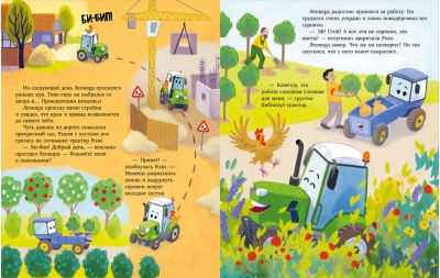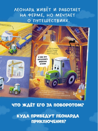 «Трактор Леонард и большое приключение» — красочная книга с множеством сюжетных подробных иллюстраций.