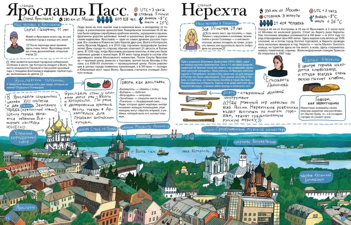 Цифры, исторические факты и сведения о географии, которые можно найти в учебниках, дополнили реальные истории людей, связанных с Транссибом, рассказы о любимых местах, рецепты блюд и советы, что посмотреть, которыми щедро поделились дети и взрослые. Собирали эти истории, подбирали факты, создавали панорамы и зарисовки из мегаполисов и маленьких поселков — Александра Литвина и Аня Десницкая, создатели известной книги «История старой квартиры», настоящего события на российском и международном книжном рынке, лауреаты множества российских и международных наград.